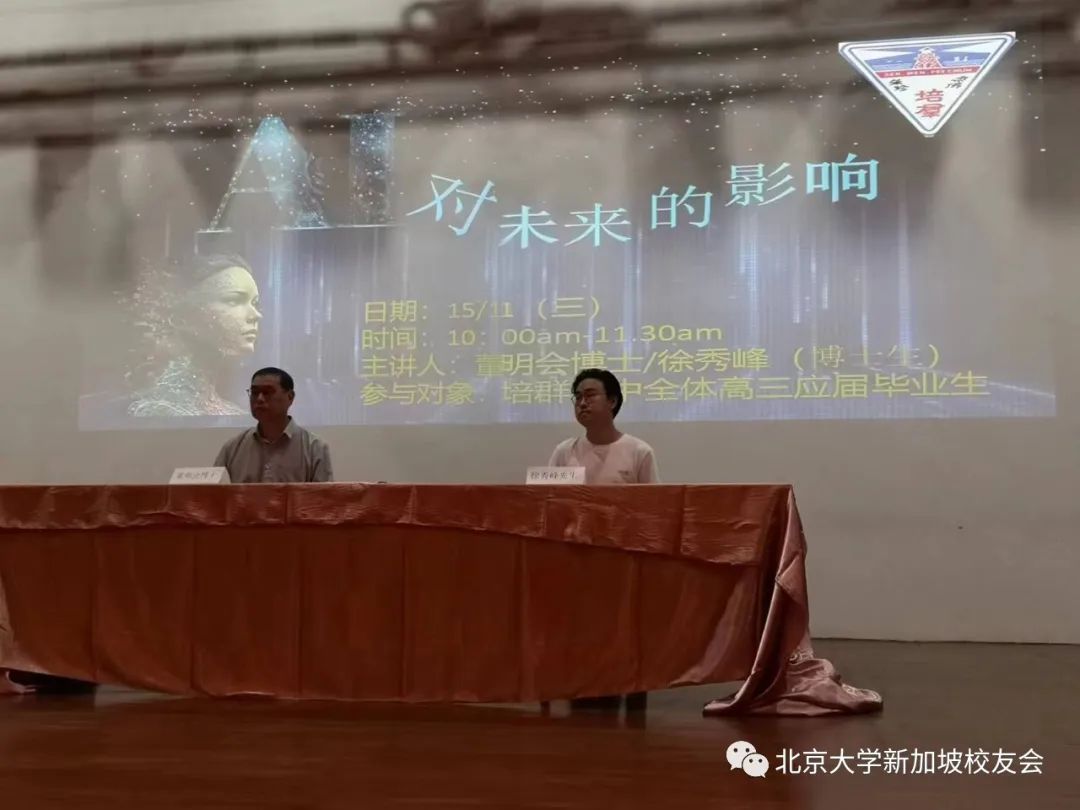 2023年11月15日,北京大学新加坡校友会(以下简称:新加坡校友会)的董明会、徐秀峰两位校友应马来西亚柔佛州笨珍独立中学邀请,为该校高中部学生举办名为“AI对未来的影响”的科普主题讲座。