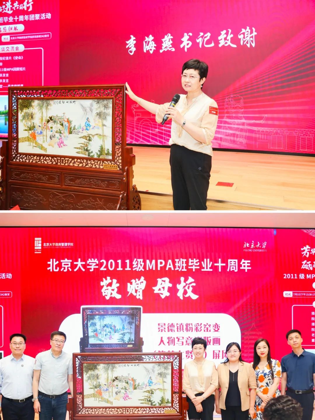 院友们为感念师恩,回报母校,赠予学院一个景德镇粉彩窑变人物写实瓷板画(竹林七贤图)屏风,寓意大气、正气、锐气。党委书记李海燕对院友们的赠送表达了感谢。李海燕指出,屏风在古代有两个作用,其一是实用作用,能够遮风,给家里带来安康;其二是美观作用,让家里不但安康而且祥和美好,希望政管大家庭能如院友期望,扎扎实实,安宁美好。在感谢院友们的同时,李海燕还提出对大家的期许,希望院友们能够如屏风所包含的寓意,未来工作成就斐然,家庭美满,“文质彬彬,然后君子”。李海燕老师最后还表示,希望院友们与学院的关系就像这座屏风的寓意,隔而不离,尽管院友们已经毕业离开,也是散亦常聚。