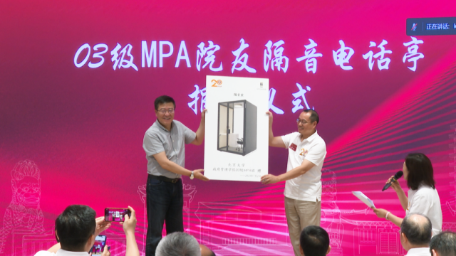 老师、院友交流结束后,2003级院友为感谢学院多年来的支持和关注,集资捐赠一个隔音电话亭来支持学院的工作,同时为师弟师妹们的学习、工作提供便利。院长燕继荣围绕“播下的光,要擦拭,种下的梦,要重温”主题为答谢院友捐赠致辞。燕继荣首先代表学院对大家表示问候和欢迎,同时也向组织参与此次活动、捐赠电话亭的同学们表示感谢,感谢大家对学院发展的大力支持。他认为,MPA院友不仅是学院的骄傲,更是挚友和伙伴,院友们彰显了政管育人的传统,他们的慷慨捐赠意义非凡,为今后学院的师生创造了更加方便的学习条件。最后,燕继荣祝愿院友们工作生活一切顺利,身体健康,万事如意。