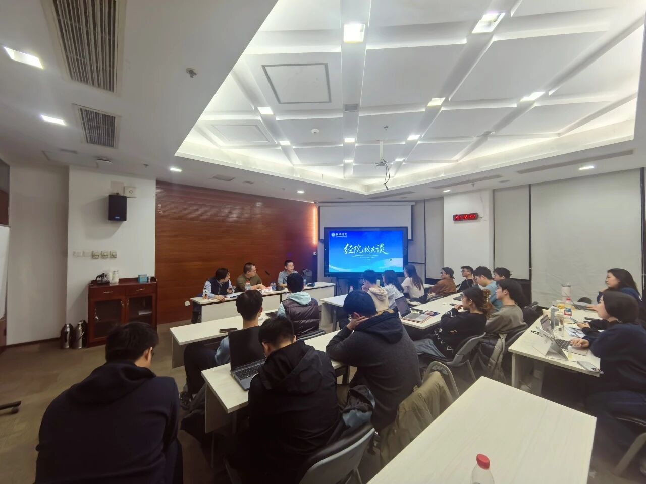 12月17日晚,北大经院举办“经院校友谈”之寻找穿越周期与市场波动的“长期确定性”圆桌交流活动。北京大学经济学院2011级本科校友谢禹韬、张宽作为分享嘉宾,与经院学子围绕职业起点选择、身份与思维转变、工作内容与个人能力储备等话题展开深入交流。北京大学经济学院职业发展中心主任杨凯博、经济学院校友办主任陈稳等30余名师生参加活动。本次圆桌交流由2024级金融学系博士研究生禹业冠主持。