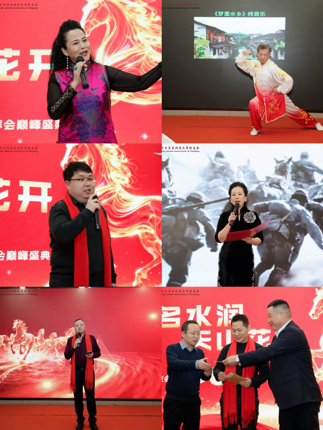 新疆北京大学校友会李锺禄、董虎臣等老学长合唱《毛主席的战士最听党的话》和《我是一个兵》,老学长们的歌声唱出了校友们对党和国家的热爱与忠诚。新疆北大校友会方建平老学长诗朗诵《中国革命永远在路上》。新疆北大校友巴特尔独唱《史诗江格尔》。罗英的朗诵《不朽》,充满张力的颂歌,诠释了我们对永恒价值的致敬与追求。新疆北大校友会刘彪学长表演的《陈氏太极拳》,行云流水,吐纳乾坤,在一招一式中,体会刚柔并济,阴阳和合的千年智慧。嘉宾带来了合唱《哈萨克毡房》《珊瑚颂》《一杯美酒》等节目,熟悉的旋律唤起在场人员心底真挚的情感。