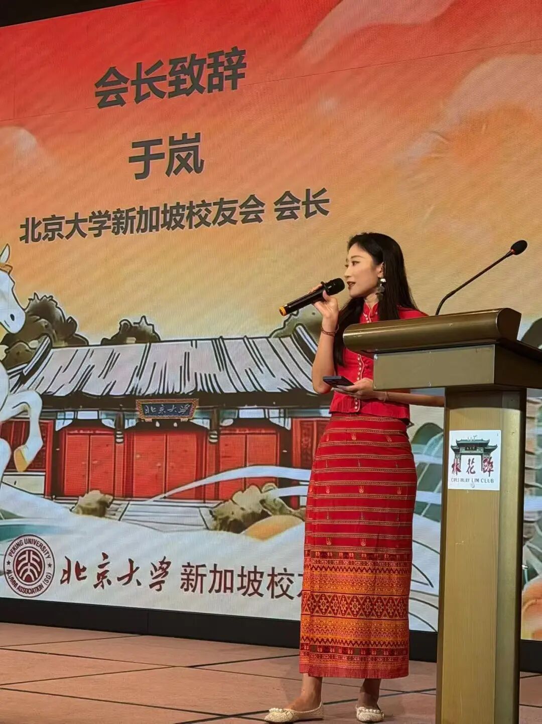 北京大学新加坡校友会会长于岚致辞。她回顾了过去一年校友会的主要活动,并对校友们的凝聚力和热情参与表示高度赞扬。她特别提到,在人工智能浪潮奔涌的时代,人与人之间真诚的情感连接显得尤为珍贵。致辞结束后,于岚邀请中国驻新加坡大使馆韩骏公参一同上台,遵循新加坡本地的“饮胜”祝酒习俗,带领全场校友举杯共饮,衷心祝愿各位校友在新的一年万事胜意、前程似锦。