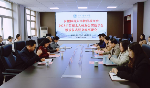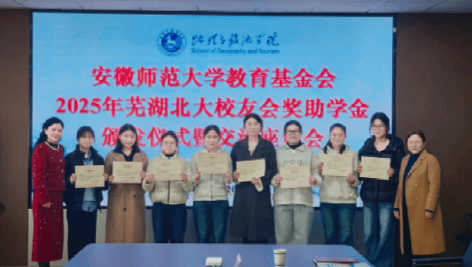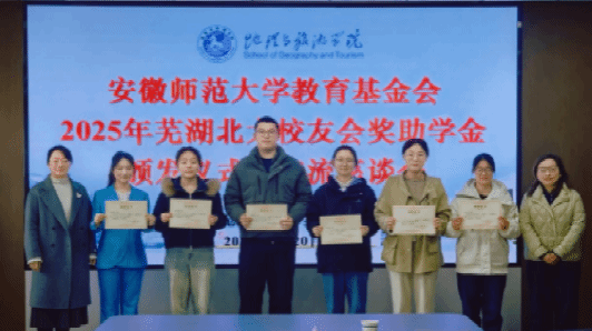 3月20日,2025年度芜湖市北京大学校友会奖助学金颁发仪式在安徽师范大学地理与旅游学院三楼会议室举行。芜湖市北京大学校友会常务副会长童劭琼、副会长周玉森等出席仪式。仪式由地理与旅游学院党委副书记钱程主持。