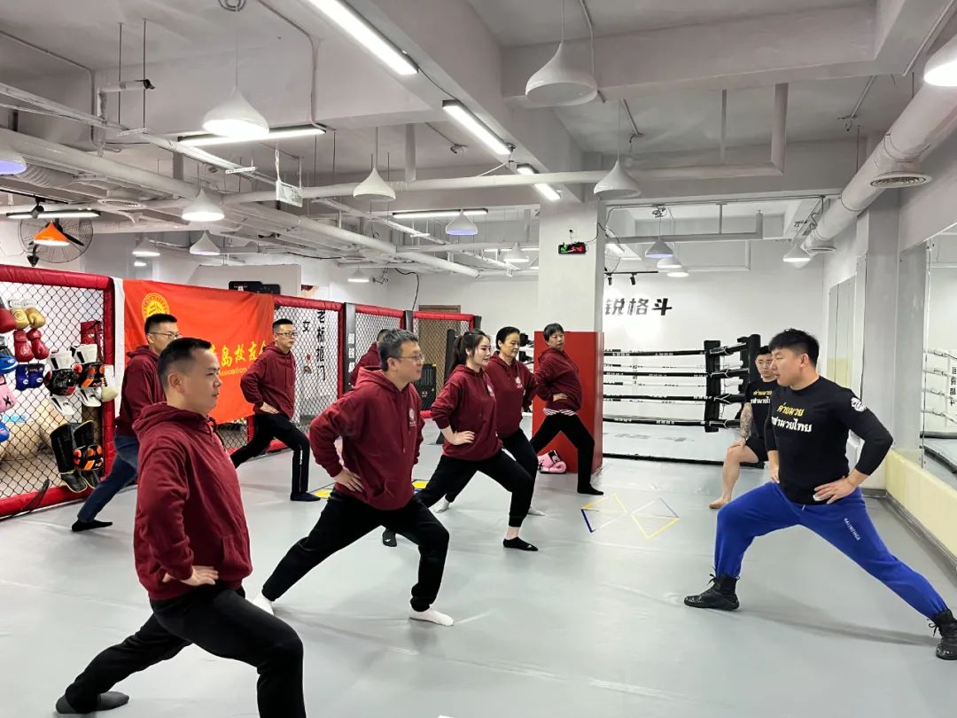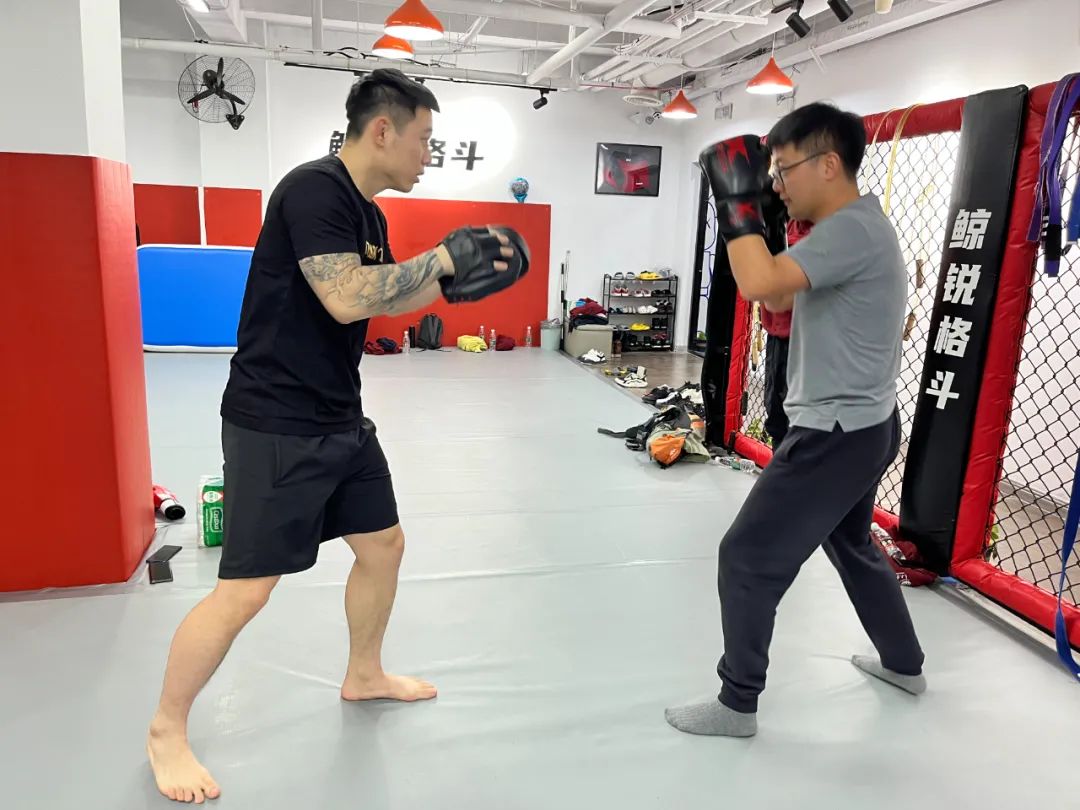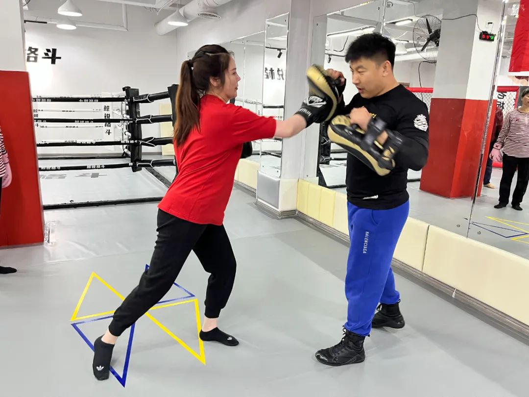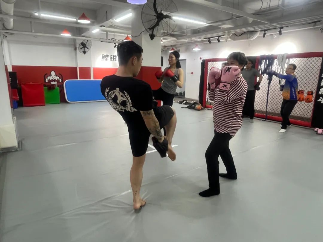 热身后,队员们挑选拳套,搏击的热情也进一步被点燃。在正式讲解前,教练和校友会搏击队队长于东升进行示范演示,随后教练慢动作教学直拳、摆拳及腿部动作,并与每位队员一对一实训,纠正大家的姿势与力道。