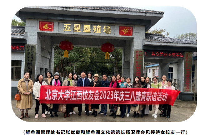 2023年3月11日,春意盎然,惠风和畅。北京大学江西校友会组织女校友们前往南昌市高新区鲤鱼洲,走进鲤鱼洲文化馆追忆难以忘怀的峥嵘岁月;徜徉香樟林荫道感受春天的蓬勃生机;步入北大分校旧址陈列馆,感知前辈的艰苦拓荒生活和特殊办学历史;置身油菜花海享受身心的惬意欢愉;畅游白鹤小镇感慨藕遇鹤舞回归自然的双栖共生,参与趣味竞赛学习“特殊技能”,增进校友姐妹的深厚情谊。