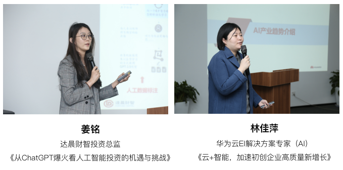 华为云EI解决方案专家(AI)林佳萍分享《云+智能,加速初创企业高质量新增长》,表示华为云EI通过云服务的方式,提供一个开放的、可信的、智能的平台,让更多的企业能够便捷使用AI和大数据服务,加速业务发展。达晨财智投资总监姜铭在本次活动分享环节中提到ChatGPT的出现让大众认识到了人工智能的力量,并已经在一定程度上能够替代简单人的工作业。同时,ChatGPT也引发了AIGC及其应用的爆发性增长,有望成为下一个投资热点。我国人工智能发展在数据方面具有极大优势,但在算力、大模型方面仍呈追赶态势,相信未来我国也将加大在ChatGPT方面的相关投入,探索出自己的人工智能发展道路。
