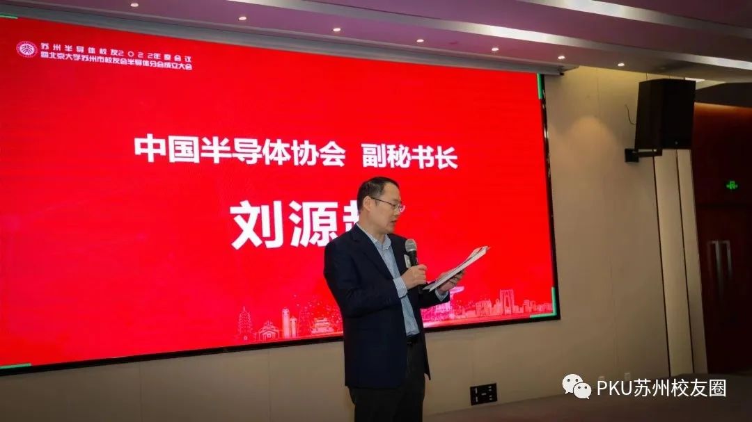 中国半导体协会副秘书长刘源超致辞。他认为这是一个令人激动的时刻,北大人能够在苏州号召半导体行业校友企业家成立分会是一件美好的事情,必将对中国半导体事业发展具有推动意义,在目前形势下北大人更需要团结努力,为国家的半导体科技自主自强做出应有的贡献。