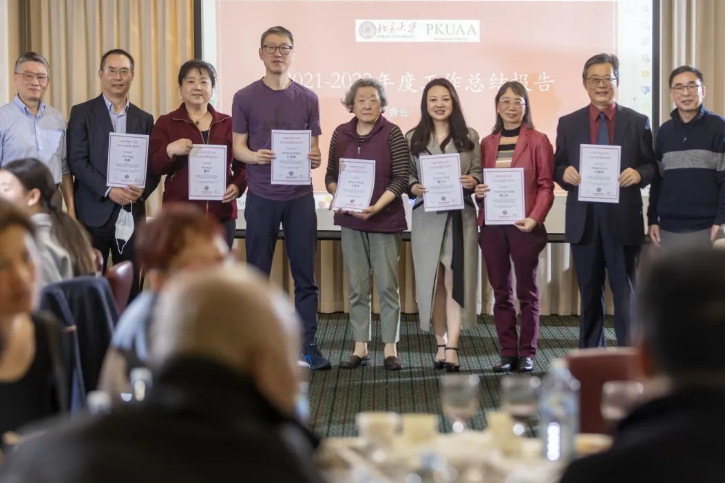 全体理事会成员合影后,两位前任会长张悦和苏达夫,为做出突出贡献的陈新宇、李明、佟玉华、曾永颁发奖状,为卸任理事会成员的陆惠丰、张佳颖、程一民、刘钢军、曹华颁发证书,对哈伟、谢建、陈杨国生、David Walker、Karen Walker等公益讲座主讲人致谢,并表彰合唱队、羽毛球队、太极养生队、摄影队、高尔夫队兴趣活动小组。随后为上一届的9位理事会成员颁发证书,并对长期支持校友会工作的舒立、徐秀志两位义工代表致以诚挚感谢。