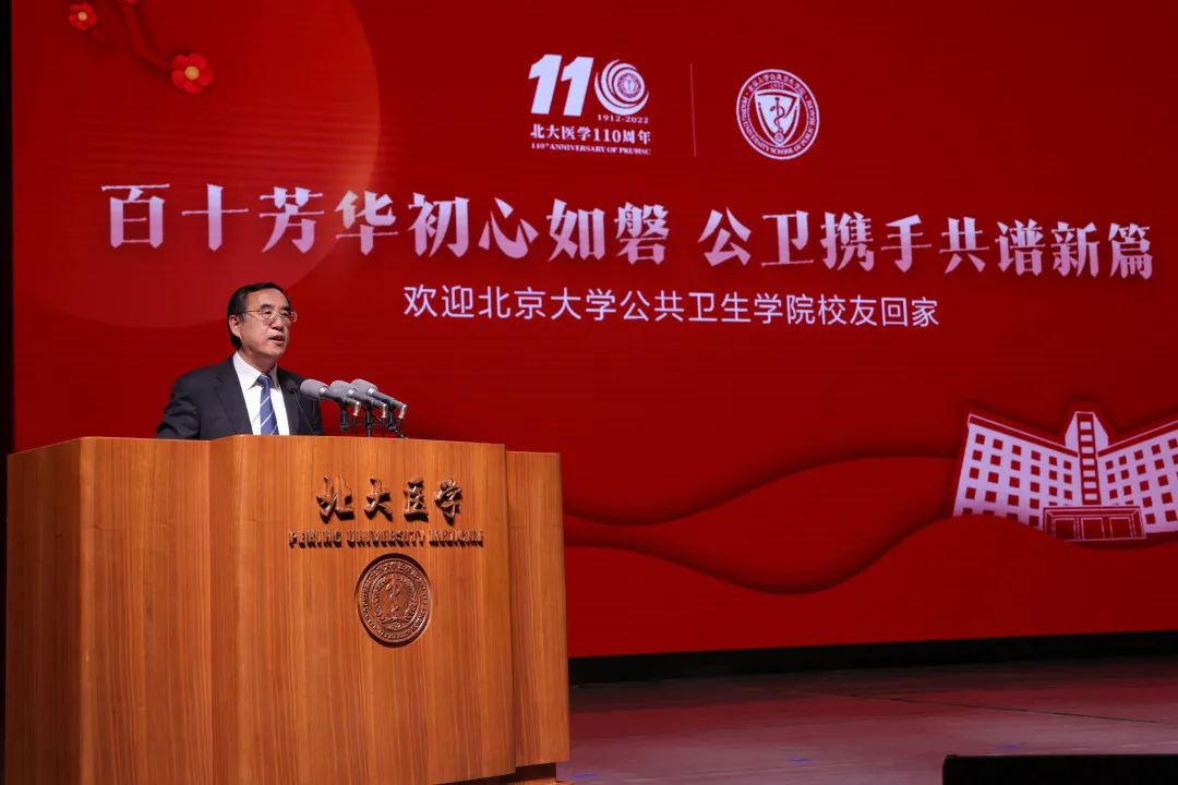 北京大学医学部党委常务副书记、北医校友会副会长徐善东致辞。他向所有返校校友表示热烈欢迎,并转达了柯杨教授的诚挚的问候;与校友一起分享了自己自求学至今对公共卫生的感悟,他说:公共卫生(的需要)在哪里,北大公卫人就在哪里。事业、格局、情怀、责任在北大公卫人身上融为一体;向当前正奋战在各地卫生健康委和疾控中心的公卫师生和校友表示深深的敬意,并祝愿所有北大公卫人事业顺利、家庭美满。