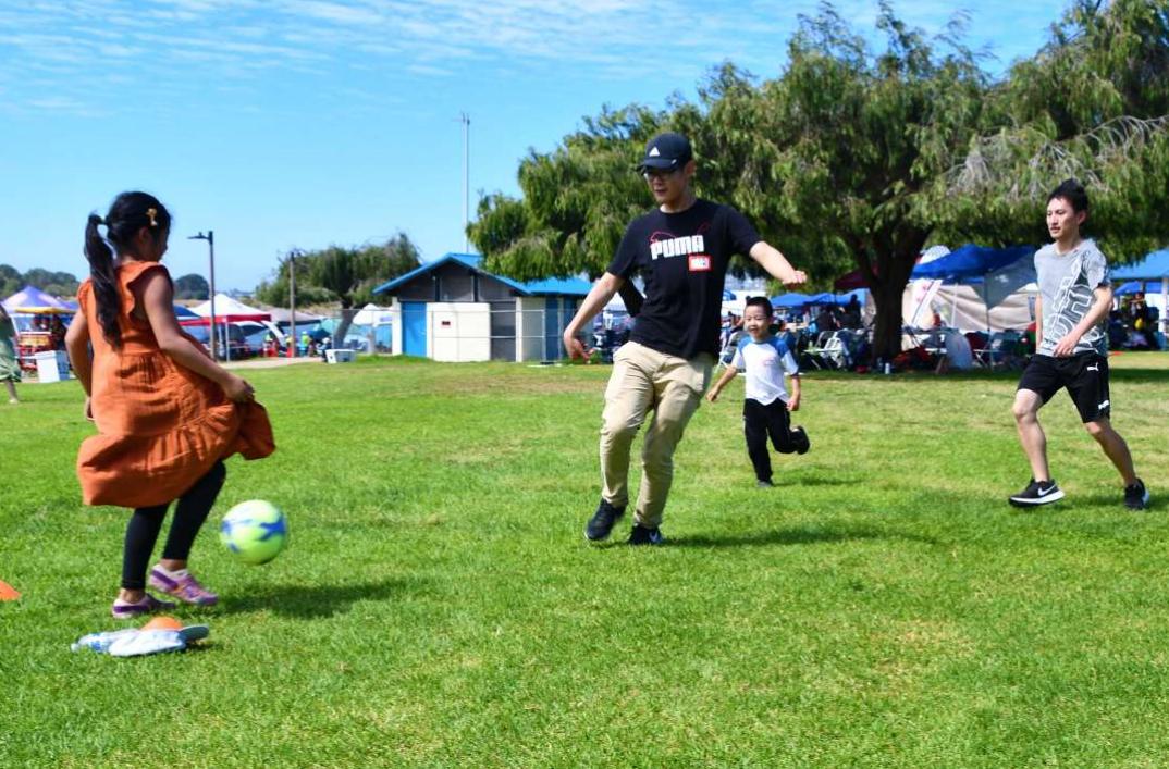 丰盛的午餐过后,张釩组织足球、排球、飞盘等活动,大人小孩都玩得不亦乐乎。