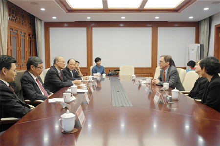 王恩哥校长早年曾在普林斯顿大学交流学习过,这让双方的会面更添一份亲切。王恩哥校长与伊斯格鲁布校长就两校生源及学生比例情况进行了交流。王校长表示,目前在北大有许多美国留学生,而北大也正积极努力为学生提供更多交流机会。数学是两校合作的首选学科。