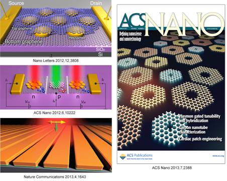 2012年初,该课题组和美国、西班牙等研究学者合作,共同研究了石墨烯表面等离激元学( Graphene Plasmonics),是该学术领域最早的研究者之一,研究内容包括利用金属纳米天线实现石墨烯增强光电探测(Nano Lett. 2012, 12, 3808; Nature Comm. 2013, 4, 1643),及利用表面等离激元在衰减过程中产生的“热电子”实现对石墨烯的有效电掺杂过程(ACS Nano 2012, 6, 10222)。更为重要的是课题组还发现石墨烯作为一种半金属,其本身的载流子浓度也能激发局域表面等离激元共振,并可以通过外加门电压实现调控(ACS Nano 2013,7,2388 期刊封面),上述工作被Science、Nature Physics等学术期刊做重点评述,评论学者认为课题组开创了“Graphene Plasmonics”这个新的研究领域,相关工作同时也被美国C&E News、德国Nanowerk,国内科学网等新闻媒体进行报导,一年内引用及评论已近百次。