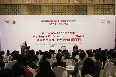 6月15日,由北京大学和美国维斯理学院共同主办,以“女性领导力:世界因此而不同”为主题的女性领导力论坛在北京大学成功举行,来自政府、企业、媒体、学术机构的中美各界的300余名杰出女性代表聚集一堂,围绕推动全球女性领导人发展、培养全球化事业下的女性领袖等话题展开讨论。该论坛作为维斯理学院与北大启动的“女性世界合作伙伴项目”(Women World Partner Program)的重要组成,开启了两校新的校际交流关系。这一历史性的合作项目是北京大学第一个全面面向女性的项目,旨在通过人文学科教育来培养女性领导能力。北京大学常务副校长柯杨,维斯理学院校长H?金?波特姆利(H Kim Bottomly)出席论坛开幕式并致辞,开幕式由北大经济学院院长孙祁祥主持。杰出学术带头人、中国教育部前副部长吴启迪,美国女宇航员、维斯理校友帕米拉?梅洛伊(Pamela Melroy)等应邀参加并发言。当晚,论坛在钓鱼台国宾馆举行闭幕晚宴,第十一届全国人大常委会副委员长陈至立、美国驻华大使骆家辉(Gary Locke)、北京大学副校长李岩松、维斯理学院校长波特姆利等出席了闭幕晚宴并致辞。