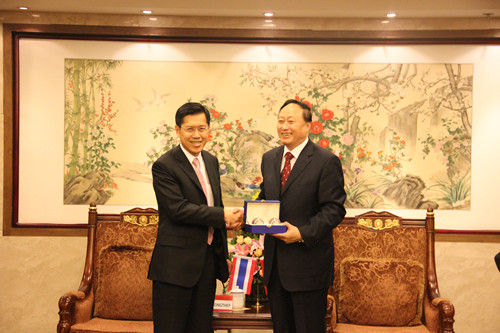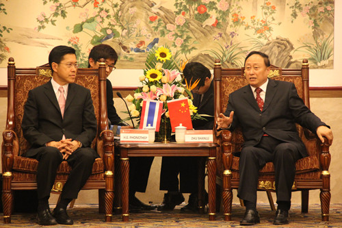 5月23日下午,泰国副总理兼教育部长蓬帖?帖甘扎纳(Pongtep Thepkanchana)一行访问北京大学。北京大学党委书记、校务委员会主任朱善璐在英杰交流中心大贵宾室会见了来宾,北京大学外国语学院院长程朝翔等陪同会见。