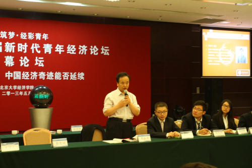 之后,在经济学院2011级硕士研究生杜浩然的主持下,开幕论坛进入学生展示、圆桌讨论环节。5名来自北京大学经济学院、南京大学商学院管理学院、中央财经大学金融学院、中国人民大学经济学院和南开大学经济学院的学生代表就“中国经济奇迹能否延续”的主题进行探讨。李林芷同学通过丰富的数据阐释了优化能源消费对经济持续增长的促进作用,凌啸飏同学论述了民间借贷合法化的合理性与重要意义,邓家品同学表明了中国人口红利在短期内不会消失的观点,邓敏婕同学强调了重新定位政府职能对于推动经济发展的重要意义,孔德明同学则对地方官员晋升激励机制提出了改进的建议。25名本科生代表就曹和平教授的演讲和学生探讨进行了热烈的讨论。青年经济学子各抒己见,他们以思想之砥砺,共同之诉求,表现了新锐的学术思维,展现了青年经济学子的风采。