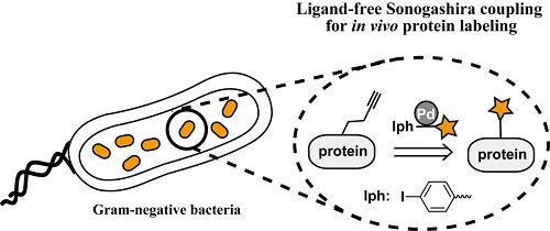 北京大学化学与分子工程学院陈鹏课题组最近在《美国化学会志》)发表了题为《无配体的钯催化剂介导的革兰氏阴性菌内蛋白质特异标记(Ligand-Free Palladium-Mediated Site-Specific Protein Labeling Inside Gram-Negative Bacterial Pathogens)》的科研论文 (J. Am. Chem. Soc., Article ASAP,DOI: 10.1021/ja402424j),报道了一种不需要配体的钯催化体系,能够在活细胞内高效地催化蛋白质与小分子的偶联反应。