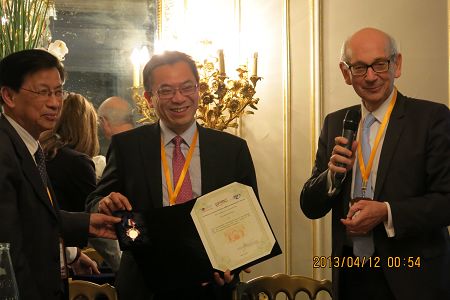 该奖项是EBMT依据法国法律设立的国际性医疗奖项,用于表彰对血液病诊治领域中做出科学创新及卓越成就个人或团体。EBMT奖项评审委员会强调此次授奖为奖励黄晓军教授在创立、完善亲属单倍型造血干细胞移植事业中所做出的突出贡献。EBMT巴黎总部负责人、“自体移植之父”高汉(Norbert C.Gorin)教授为黄晓军教授颁发奖杯和勋章,并称赞黄晓军教授这一成就将在世界范围内改变未来造血干细胞移植事业的格局。中国驻联合国教科文组织全权代表尤少忠先生、中国驻法大使馆科技公参韩军先生、EBMT主席马乐嘉(Alejandro Madrigal)教授、中国工程院院士阮长耿教授到会见证了这一重大历史时刻并表示祝贺。