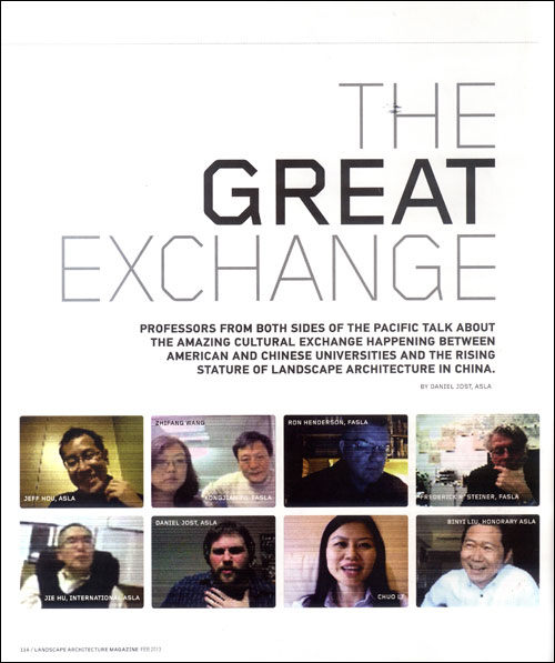 这一期还专门以“大交流”为题,邀请中美两国知名大学的教授,以宏大的社会发展和中美两国文化交流历史为背景,研讨了中美景观设计教育方面的大交流,中国的景观设计教育情况以及中美景观设计教育的差异比较,并展望了未来学科发展趋势。杂志连线采访了北京大学的俞孔坚和王志芳、清华大学的胡洁、同济大学的刘滨谊等国内知名大学的教授,以及美国多个大学的教授,包括德克萨斯Austin大学建筑学院院长 Frederic Steiner, 宾州大学景观设计学院院长Ron Henderson, 西雅图华盛顿大学景观设计系主任Jeff Hou教授等。