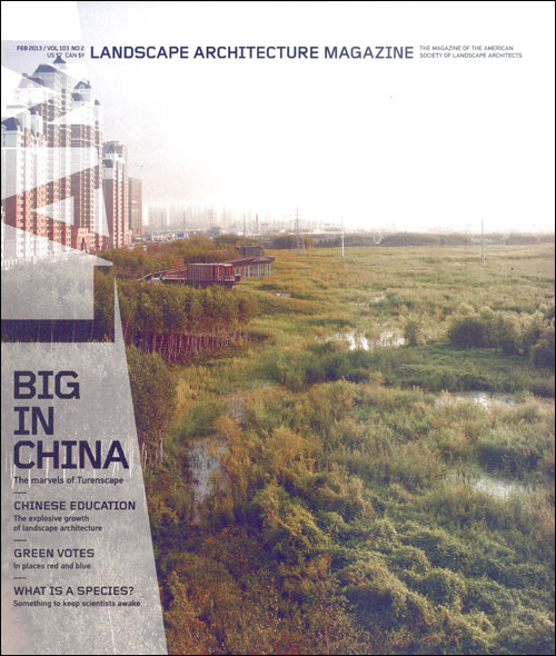 美国景观设计师协会主办的行业权威杂志《景观设计》(Landscape Architecture Magazine) ,2013年2月刊, 用俞孔坚教授(北京大学建筑与景观设计学院院长;美国哈佛大学景观设计与城市规划兼职教授;北京土人景观与建筑规划设计研究院首席设计师)的著名论断“景观设计学是一门生存的艺术”作为开篇,用了几乎全部版面,介绍了中国的景观设计实践和景观设计教育。以“中国之幸”为题,介绍了俞孔坚在开拓当代景观设计学方面的成就。“俞孔坚令世界景观设计界着迷:无论是在中国还是在美国、无论是行业新手还是资深设计师。这或许不仅仅因为他是一位户外环境设计的先锋——中国在这方面有很长的发展历史——更是因为他让中国的官员们认识到,在他们飞速地推进中国城市化的进程中,也为城市埋下了巨大的生态灾难的隐患。他的作品大多惊人的美丽——这为土人设计博得了9个ASLA奖项的桂冠。”