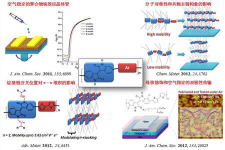 有机薄膜晶体管具有低成本、轻便、柔性和可用于大面积溶液加工等特点,在逻辑电路,显示器件和射频电子标签等领域具有巨大的潜在应用。比起小分子材料,聚合物材料具有更好的溶液加工性,更好的机械性能和热力学稳定性。传统聚合物场效应晶体管的研究主要集中在噻吩类聚合物,但是该类聚合物迁移率较低,并且在空气中稳定性差,很难满足进一步的商业化要求。另一方面,聚合物材料中结构和性能关系的研究还很不成熟,进一步阻碍了该领域的发展。
