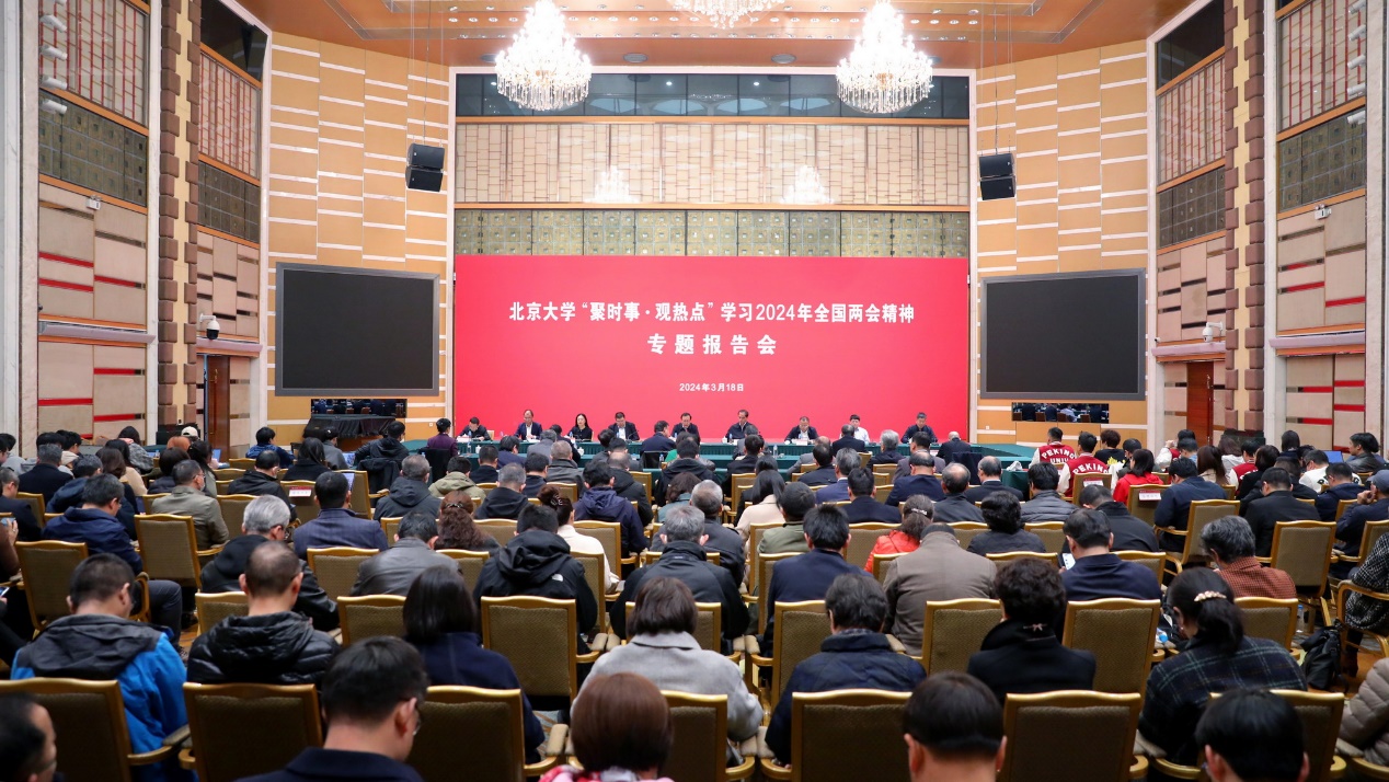 为深入学习贯彻习近平总书记在全国两会期间的重要讲话和全国两会精神,2024年3月18日上午,北京大学在英杰交流中心阳光厅举行“聚时事·观热点”学习2024年全国两会精神专题报告会。第十四届全国人大二次会议主席团成员、全国人大常委、全国人大外事委员会副主任委员、校党委书记郝平领学习近平总书记有关重要讲话和全国两会精神,校长龚旗煌结合学校发展重点任务部署全国两会精神的落实工作,部分全国两会代表委员作报告。校领导班子成员出席会议。中层正职干部、机关党员代表、各民主党派和无党派人士代表和师生代表参加会议。校党委副书记、统战部部长姜国华主持会议。