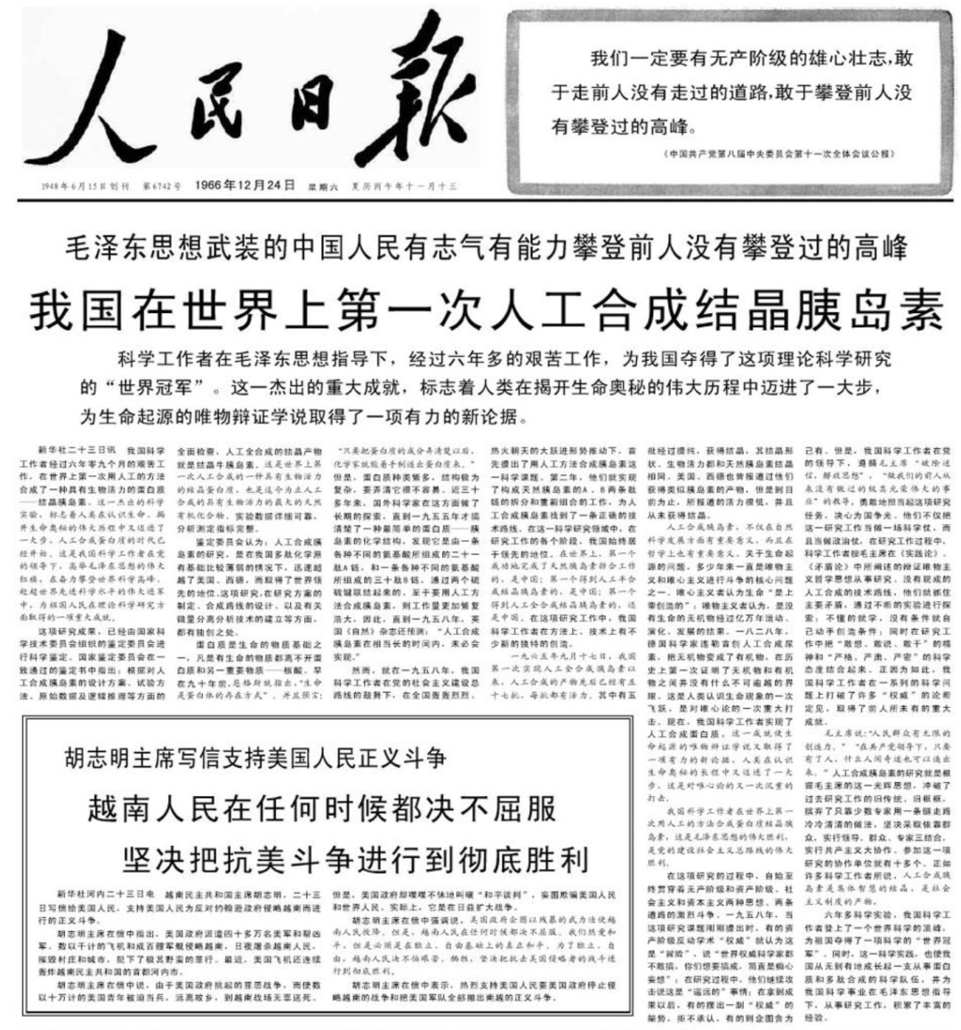 1966年12月24号,《人民日报》以头版头条刊登了我国在世界上第一次人工合成结晶胰岛素的文章,骄傲地宣布:世界上第一个成功地完成了天然胰岛素拆合工作的、得到人工半合成结晶胰岛素的、得到人工全合成结晶胰岛素的都是中国人。