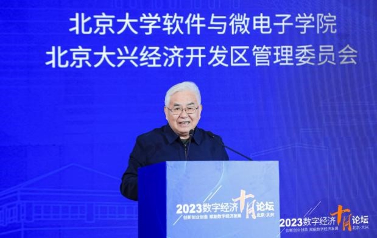 11月26日,2023数字经济十月论坛在北京大兴之星会议中心举行。教育部高等教育司副司长高东锋,北京大学党委副书记、副校长宁琦,大兴区政府党组成员、副区长周冲,北京市经济和信息化局信息化与软件服务业处处长尤靖等领导出席。中国工程院院士、中国计算机学会原理事长、清华大学教授郑纬民,长江商学院教育发展基金会理事长周春生教授作论坛主旨报告。北京大学软件与微电子学院领导班子成员,大兴经开区领导班子成员,以及300余位专家学者、软微学院师生校友和企业代表参加活动。