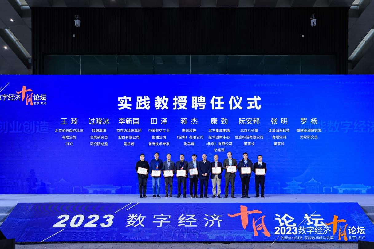 北京大学软件与微电子学院院长吴中海教授为腾讯集团副总裁蒋杰、京东方科技集团副总裁李新国、北方集成电路技术创新中心总经理康劲、联想集团首席研究员过晓冰、微软亚洲研究院资深研究员罗杨等9位企业专家颁发实践教授聘书。
