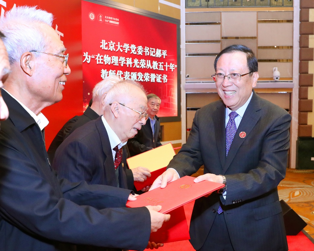 庆祝会上,郝平和龚旗煌为“在物理学科光荣从教五十年”的教师代表颁发了荣誉证书。