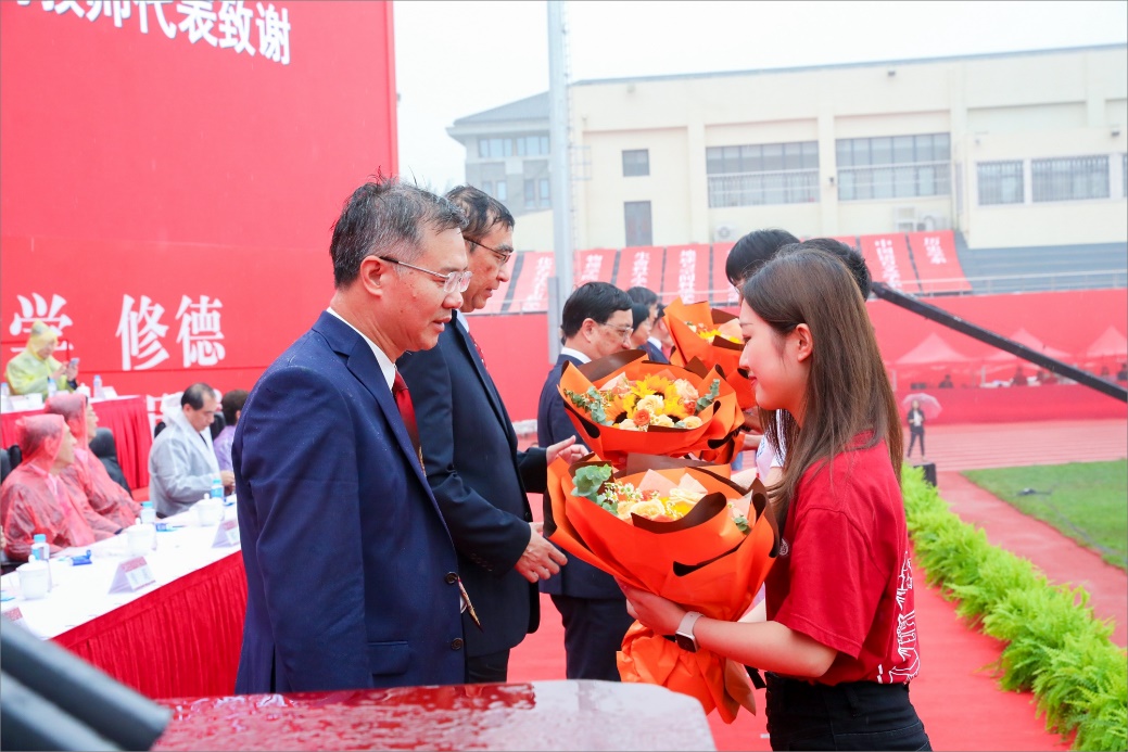 在第39个教师节即将到来之际,新生代表步入主席台,将手中鲜花送给教师代表们,向辛勤育人的老师们表达感激之情和深深敬意。
