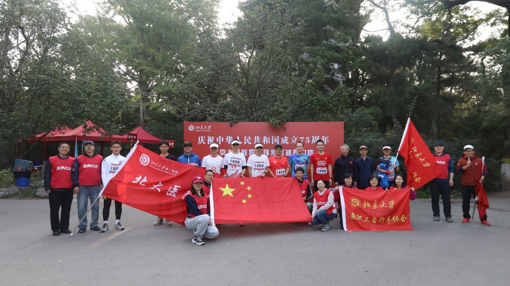 10月12日,北京大学工会组织来自校本部、医学部、附属医院的教职工400余人进行环未名湖接力跑,庆祝中华人民共和国成立75周年,图为起跑仪式