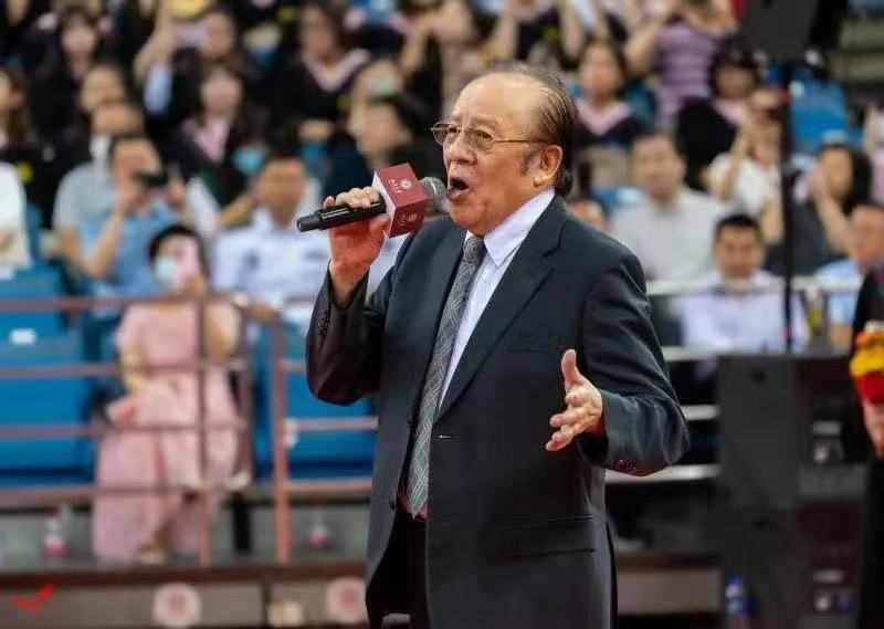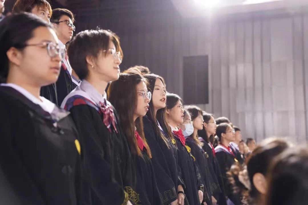 毕业典礼在国歌声中拉开了帷幕,全体师生高唱国歌,用嘹亮的歌声向建党102周年献礼。