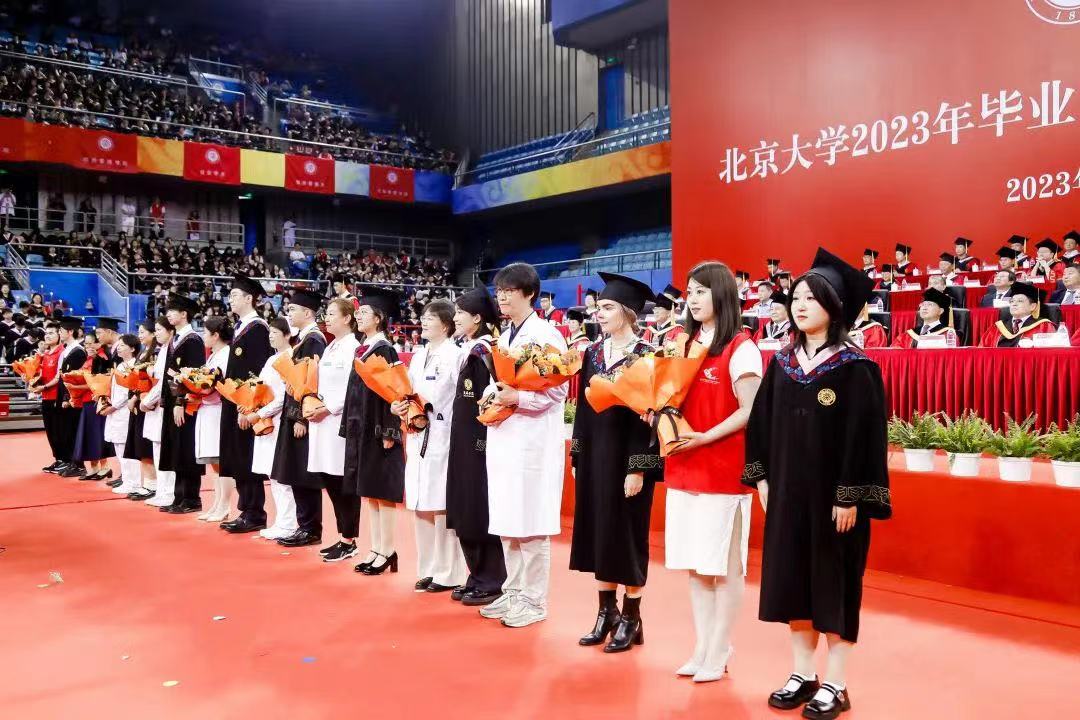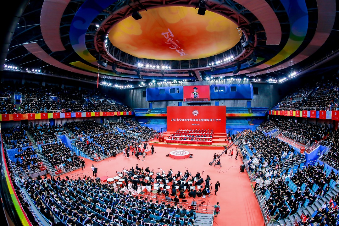 北京市委常委、教育工委书记游钧,北京市委教育工委副书记、市教委主任李奕,北京大学党委书记郝平教授、校长龚旗煌院士等学校领导,教师代表中国科学院院士、北京大学李兆基讲席教授、理学部主任谢晓亮,北京大学博雅讲席教授、哲学系朱良志,中国科学院院士、北京大学生命科学学院赵进东,北京大学公共卫生学院院长詹思延教授,以及外籍专家代表北京大学哲学系助理教授、研究员王小塞博士,各学部、各院系的老师们,中学校长、校友、奖助学金捐赠人代表与4239名2023届本科毕业生、100余名往届本科毕业生来到典礼现场,共同见证本科毕业这一人生中的重要时刻。毕业生家人和亲友通过现场观看和视频直播的方式同步参加。毕业典礼由北京大学党委常委、副校长、教务长王博主持。