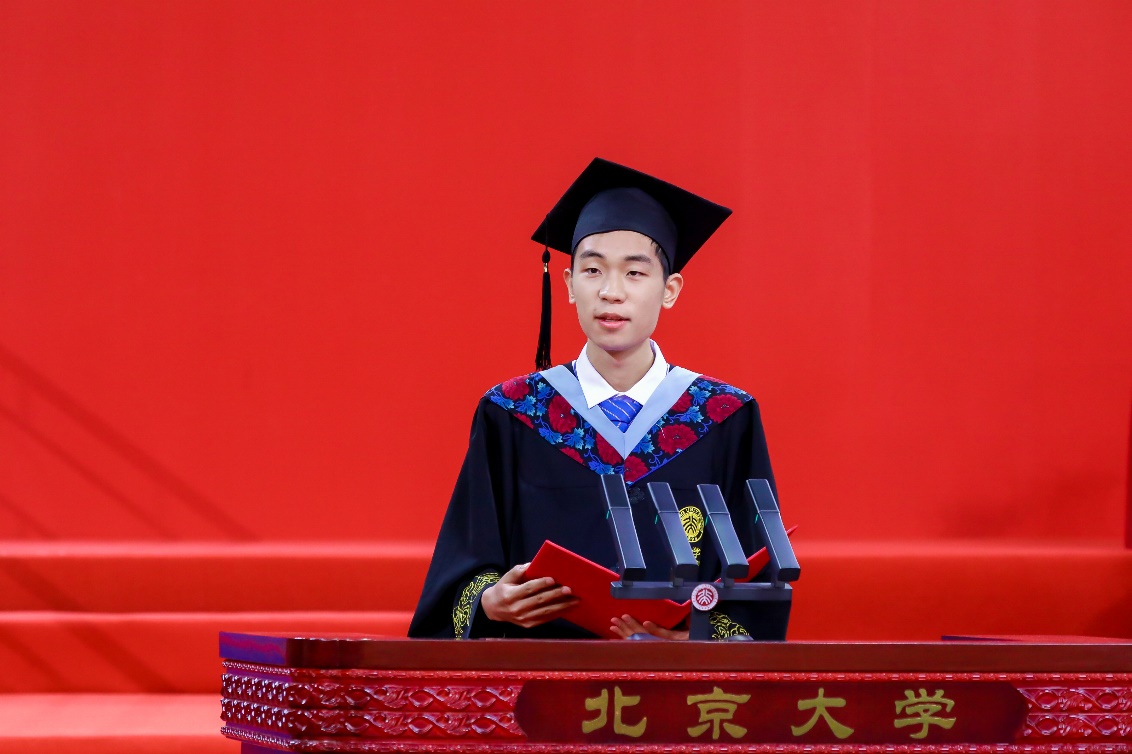 毕业生代表、物理学院2019级天文学系本科生王子铭分享了自己探索星空的经历。他认为,在北大,有许多重要的事情看不见但听得到,正是这些无形的声音一次次帮他找回信心,给予他继续前进的勇气和底气。在今后的旅途中,我们仍会遇到困难、感到迷茫,那时,我们更应该仔细聆听心中坚定求知、不断求索的声音。