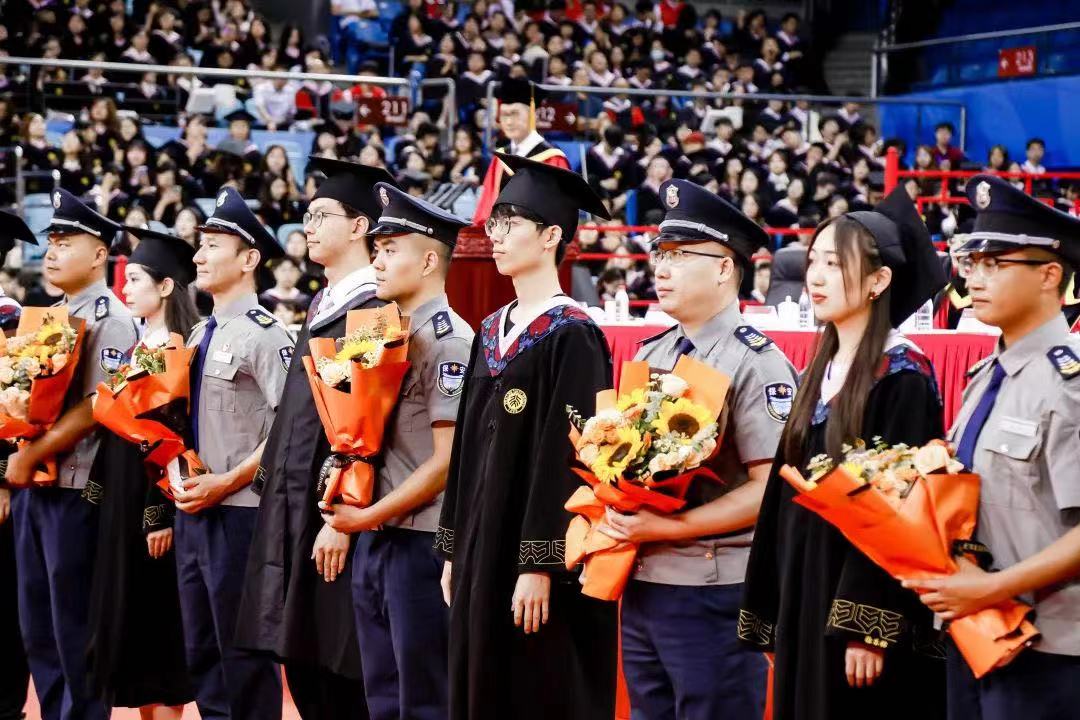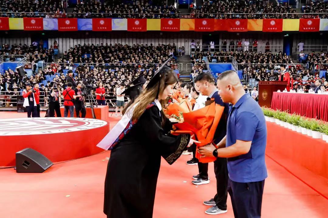 同学们今天学有所成,离不开很多人的陪伴与支持。老师、辅导员、教务员、医护人员、志愿者、保安、楼长、食堂师傅和保洁阿姨为毕业生们送上一句句温暖的关怀和真挚的祝福,看着一张张熟悉的面庞,听着伴随自己度过四年时光的熟悉声音,毕业生代表向教学科研及教辅人员、医护人员及抗疫志愿者、保安员、学生辅导员、厨师及餐饮服务人员、后勤服务保障人员代表献花,感谢全体教职员工的辛勤付出,表达对他们的感恩和爱戴之心。