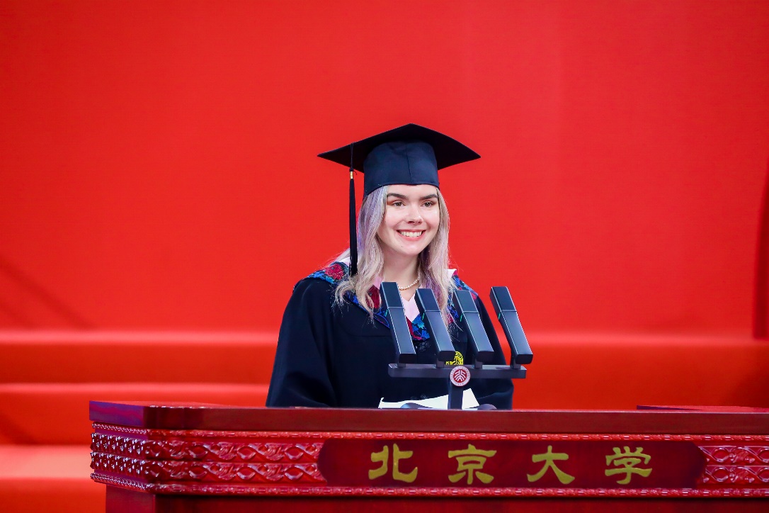 毕业生代表、光华管理学院2019级本科生苏梦兰是一位来自加拿大的留学生。在她看来,北大是中国最好的大学,这里有最优秀的老师和学生,和他们在一起学习交流,使她更好地认识了中国、认识了世界,也认识了自我。她表示,我们生活在同一个地球村,立己达人、同舟共济,方能共克时艰、行稳致远。只要世界青年携起手来,一定会让人类大家庭更加生机盎然。