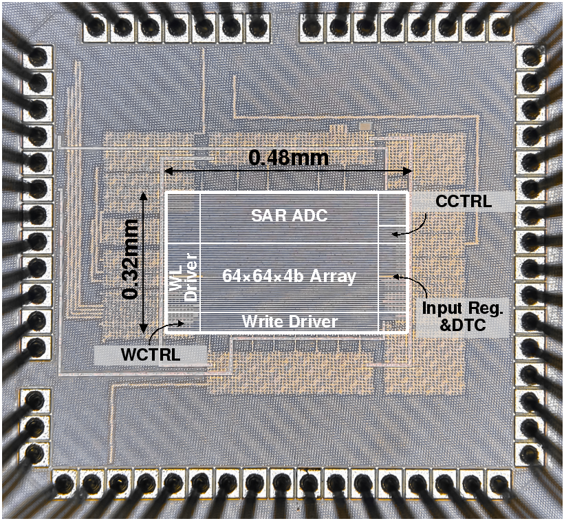 基于上述创新设计,课题组研制了一款基于65nm CMOS工艺的电流型eDRAM模拟存内一体芯片(图2),并对芯片进行了性能测试与汇报。在4-b输入/4-b权重/5-b输出精度的情况下,16Kb容量的原型芯片实现了233~304 TOPS/W的计算能效与2.963 TOPS/mm2的单位面积算力,达到电流型存算一体芯片中的国际领先水平。该创新通过将模拟权重的编程与计算统一到电流域,大幅提高了模拟存算一体电流的计算精度与鲁棒性。