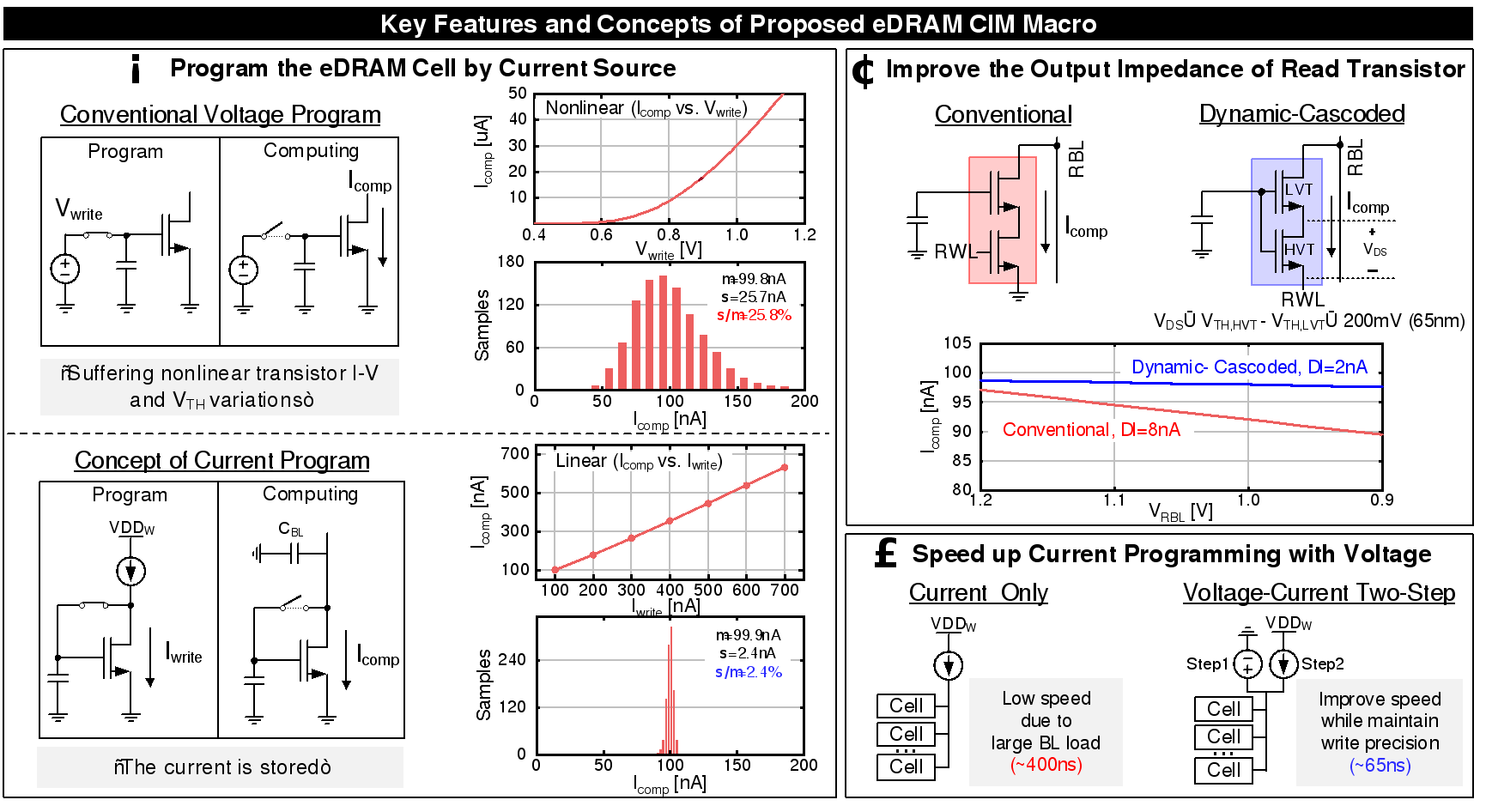北京大学人工智能研究院类脑智能芯片研究中心唐希源研究员课题组在国际集成电路设计领域顶级会议IEEE Custom Integrated Circuits Conference(CICC)上发表论文“A Calibration-Free 15-level/Cell eDRAM Computing-in-Memory Macro with 3T1C Current-Programmed Dynamic-Cascoded MLC achieving 233-to-304-TOPS/W 4b MAC”,发布了一种最新研制并实现的基于65nm CMOS工艺的电流型eDRAM模拟存内一体芯片,该创新工艺通过将模拟权重的编程与计算统一到电流域,大幅提高了模拟存算一体电流的计算精度与鲁棒性。