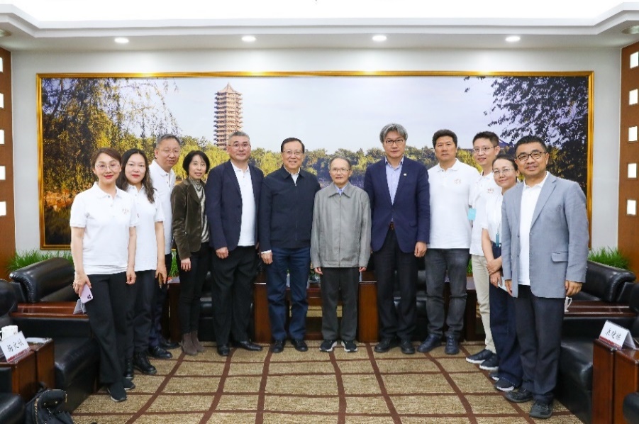 庆典活动前,郝平、王博与1988级校友代表、教师代表座谈,亲切交流并合影留念。