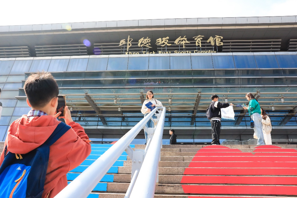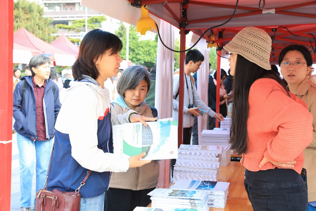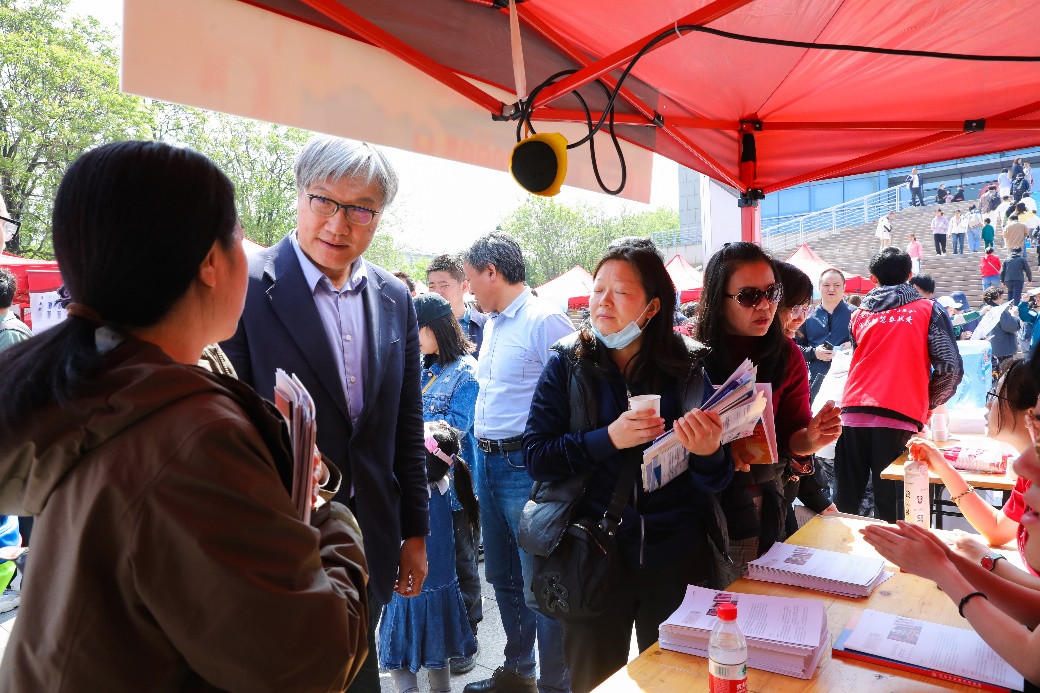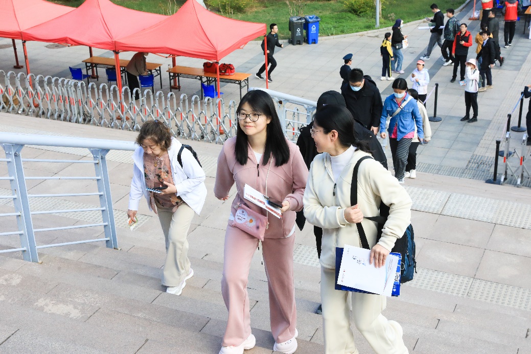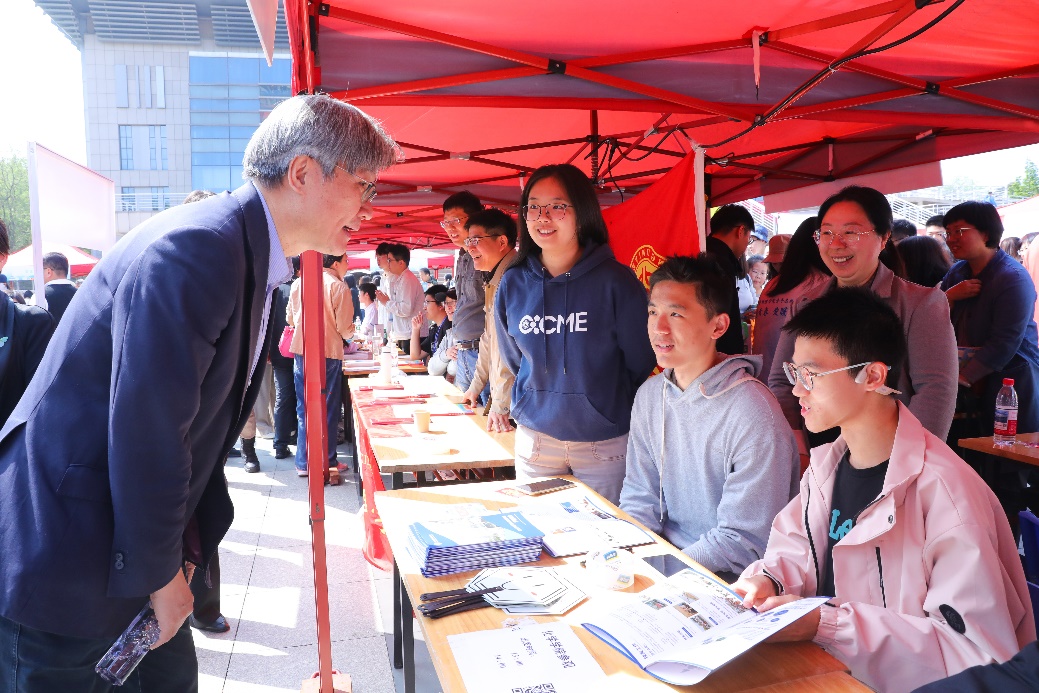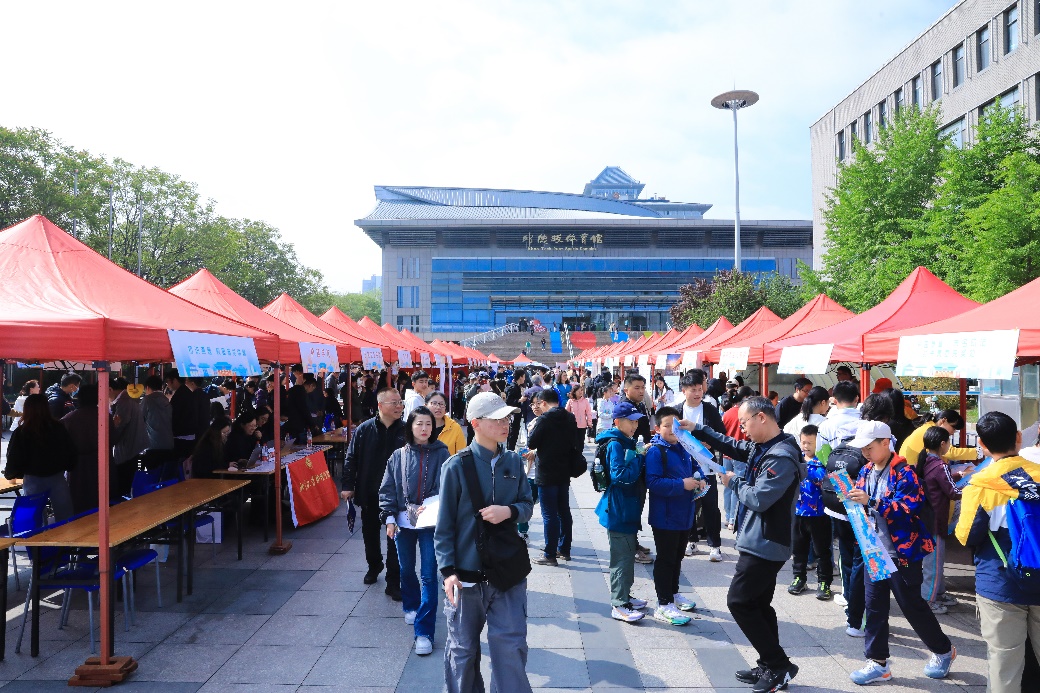 邱德拔体育馆前的广场上,各院系和兄弟院校的咨询展台气氛火爆,人流熙攘。考生和家长针对自己的兴趣和成绩等具体情况,来到对应的院系前进行咨询,现场工作人员和学生志愿者热心、耐心且细心,对咨询者的问题作出细致准确的回答。