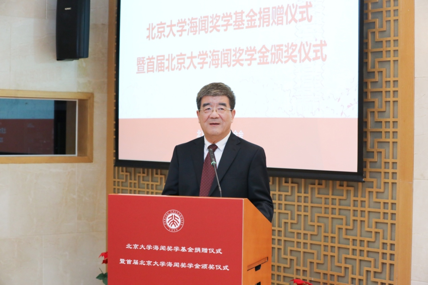 王博表示,海闻是北大1977、1978级校友的优秀代表,他海纳百川,既是深受学生喜爱的教师,又是熟悉教育工作的管理者,一直以来为北大教育事业的发展作出了诸多贡献。2004年,海闻领衔创办了汇丰商学院,为北大学生提供了更多的学习和发展机会。他感谢海闻和汇丰商学院校友们的捐资,希望这项奖学金能够不断延续和扩展,也希望获奖学生能够将这份真诚的爱心不断传承下去。