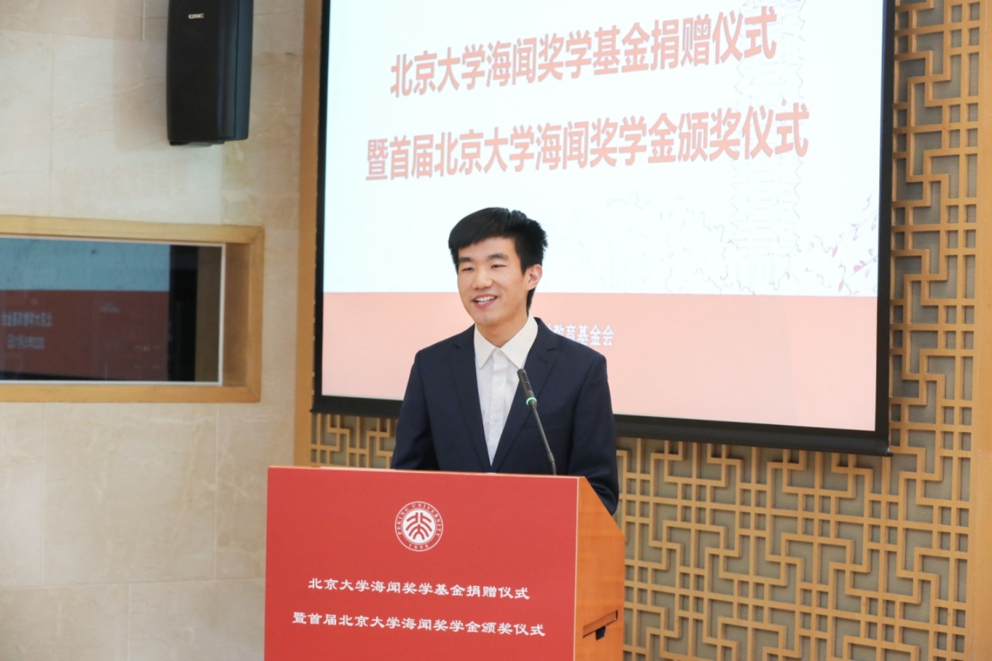 海闻、捐赠方代表和北大学生工作部部长、团委书记户国栋向获奖学生代表颁发奖学金证书。获奖学生代表、哲学系2019级本科生王子路表示,奖学金不仅是经济上的奖励,更是精神上的鼓舞,未来将继续秉承求知精神,做好专业工作的同时,保持开阔的视野,脚踏实地、精益求精,不负学校与海闻老师的希望与期许。