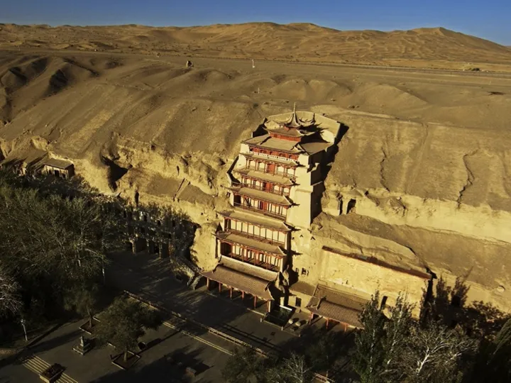 以石为窟,取其永久之意。敦煌石窟主要包括敦煌莫高窟、西千佛洞,瓜州榆林窟、东千佛洞等,因其位置、内容、艺术风格相近,可统称为敦煌石窟群。其中,莫高窟以其宏大的规模、丰富的遗存和卓越的艺术成就,成为敦煌石窟群的代表之作。公元366年,乐尊和尚在鸣沙山开凿第一个洞窟,此后十个世纪里,莫高窟成为佛教艺术的宝库。