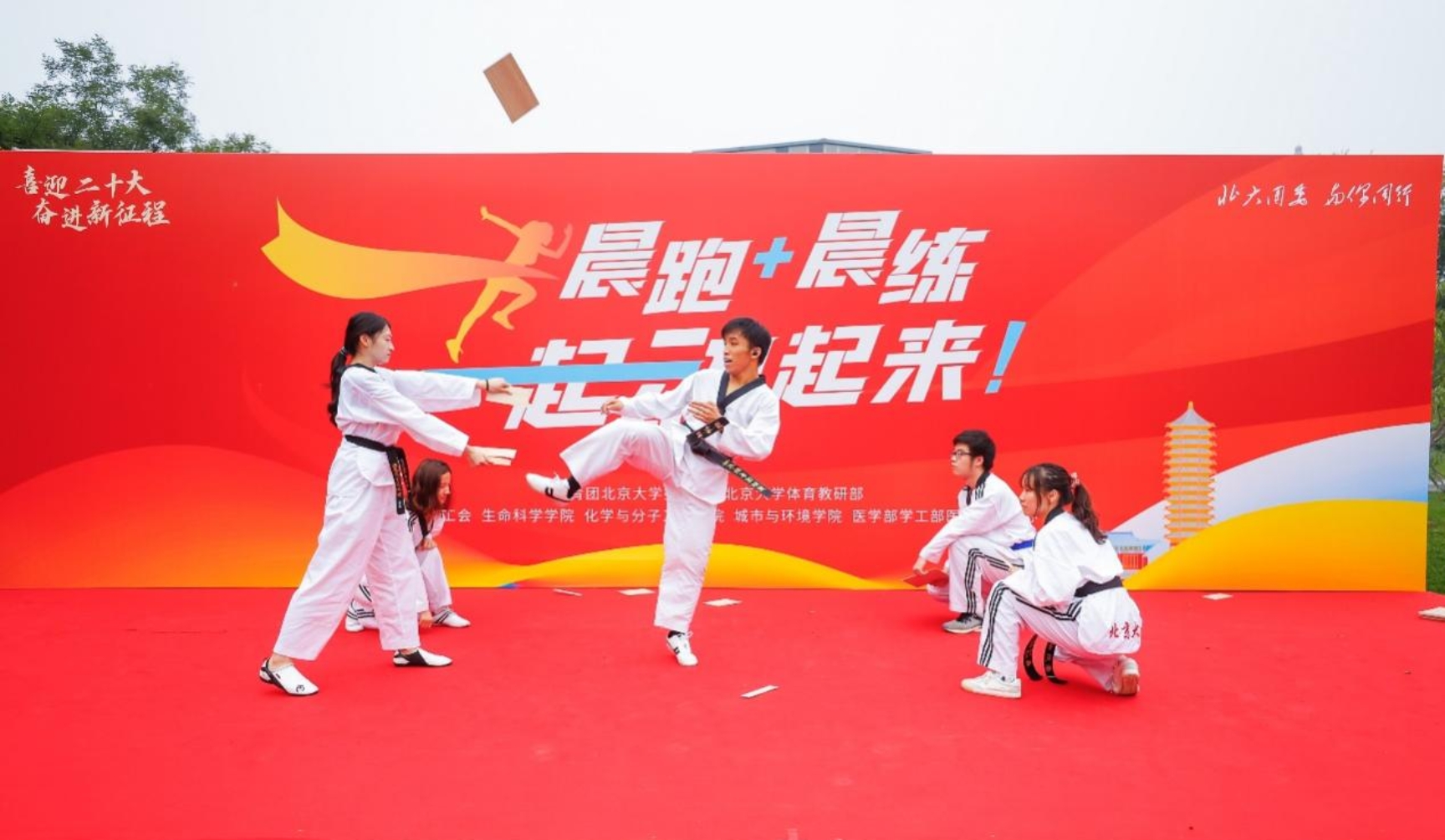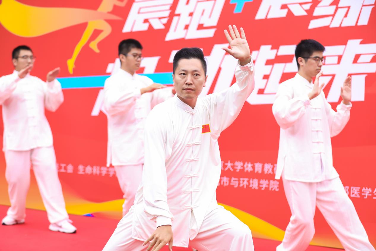 体育教研部教师、太极拳世界冠军柴云龙,陈式太极拳第十三代传人、国际太极拳比赛冠军谢海江,体育教研部教师、健美操世界冠军、国际级健将运动员车磊,北京大学学生跆拳道社团等为参与活动的师生们带来了体育节目展演。校领导为参加活动的师生代表发放晨跑大礼包并合影留念。鸣枪令响,20分钟2千米的青春奔跑正式开始,师生环绕着美丽的未名湖畔,不断奔跑向前。这次活动进一步彰显了北京大学“健康校园,体育先行”育人理念,引导学生通过接力奔跑养成“要运动、爱运动、越动越快乐”的良好习惯,努力成长为“德才均备、体魄健全”的北大青年。