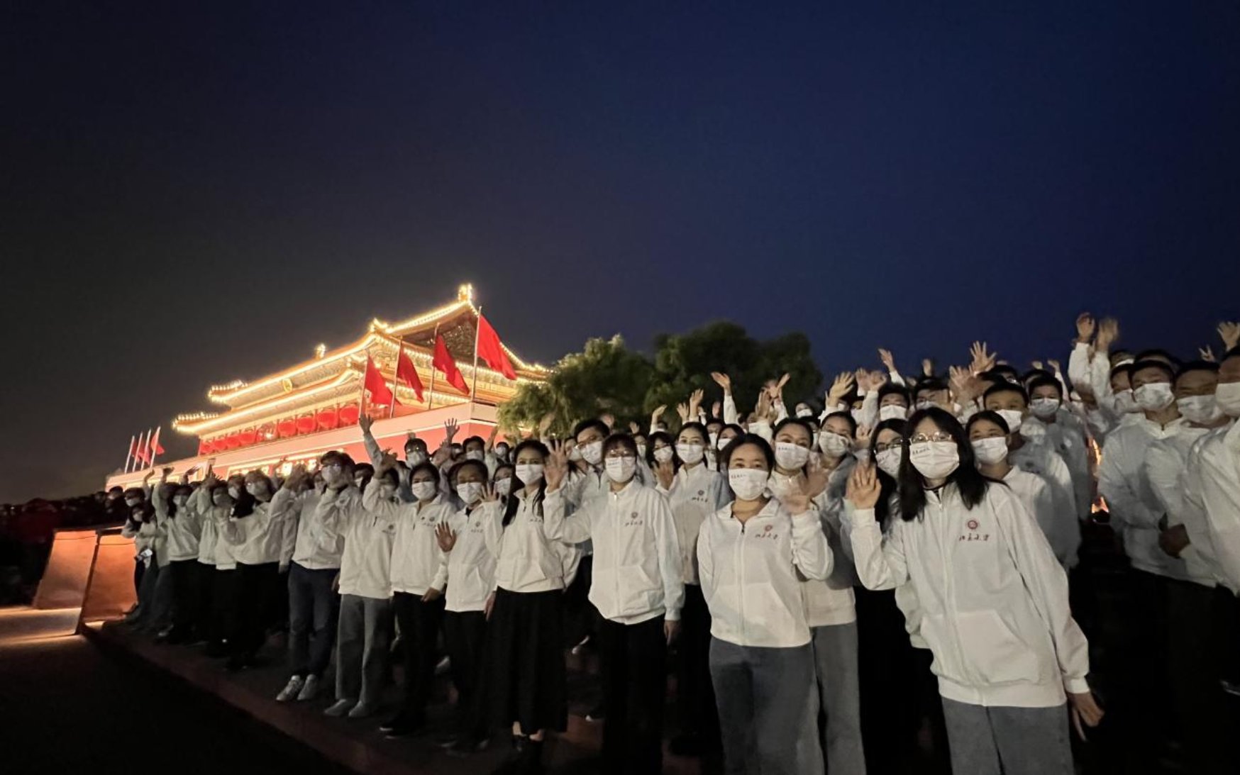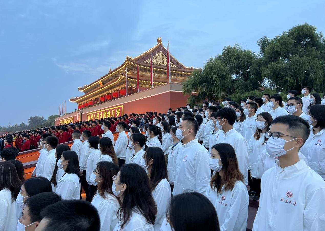 凌晨三点,沐浴着星光,北大师生自学校出发。日出东方,叩启苍穹,迎着清晨的阳光,天安门广场上,鲜艳的五星红旗冉冉升起,北大学子再次喊出“团结起来,振兴中华”“请党放心,强国有我”的嘹亮口号,为祖国母亲送上真挚祝福。