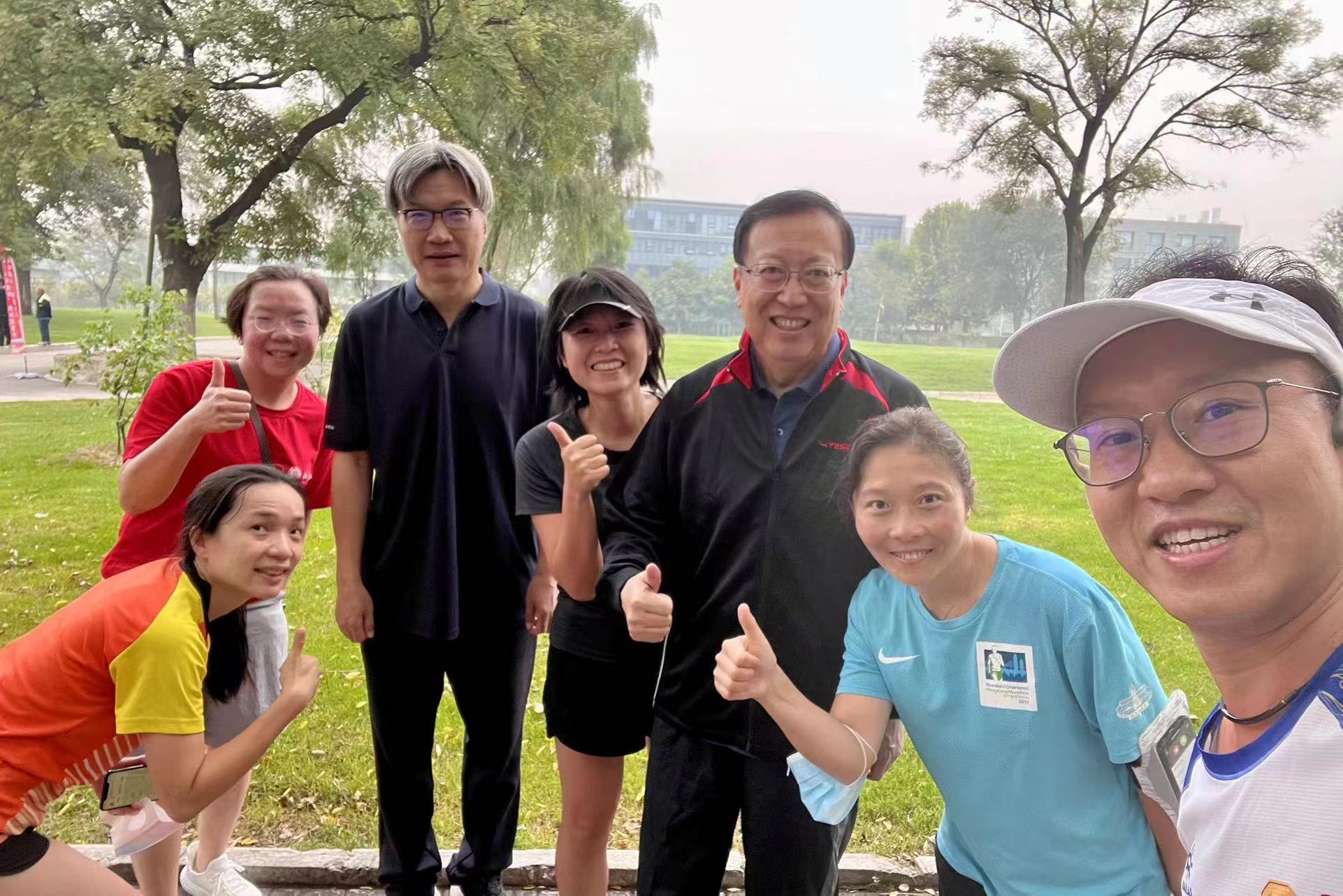 10月1日上午8时,校团委、体教部联合机关工会、生科、化学、城环、医学预科等单位举行“国庆九天欢乐跑 师生喜迎二十大”户外晨跑晨练活动,引领北大师生以昂扬向上的精神面貌共庆祖国华诞、喜迎党的二十大胜利召开,用实际行动践行“完全人格,首在体育”的使命担当,用矫健身影展现北大人的活力朝气。郝平、龚旗煌、王博、顾涛、孙庆伟、宁琦、董志勇,以及来自全校各院系、各单位的师生代表、运动团队及香港培训班学员等参加活动。
