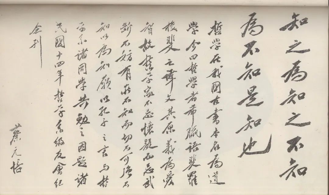 鸿蒙肇判,风气始开。 蔡元培先生 就任北大校长。这位爱好哲学与佛学的校长为1925年哲学系毕业同学纪念刊《海天集》题词: “知之为知之,不知为不知,是知也。” 老校长以此勖勉哲学系同学,堪称“系训”。更重要的是,他为北大哲学带来了“思想自由,兼容并包”的新风。于是,哲学系成了引领新思想的策源地。 学有专长的先生们,荟萃于斯,冷静而不乏激情,书写中国文化的新方向: