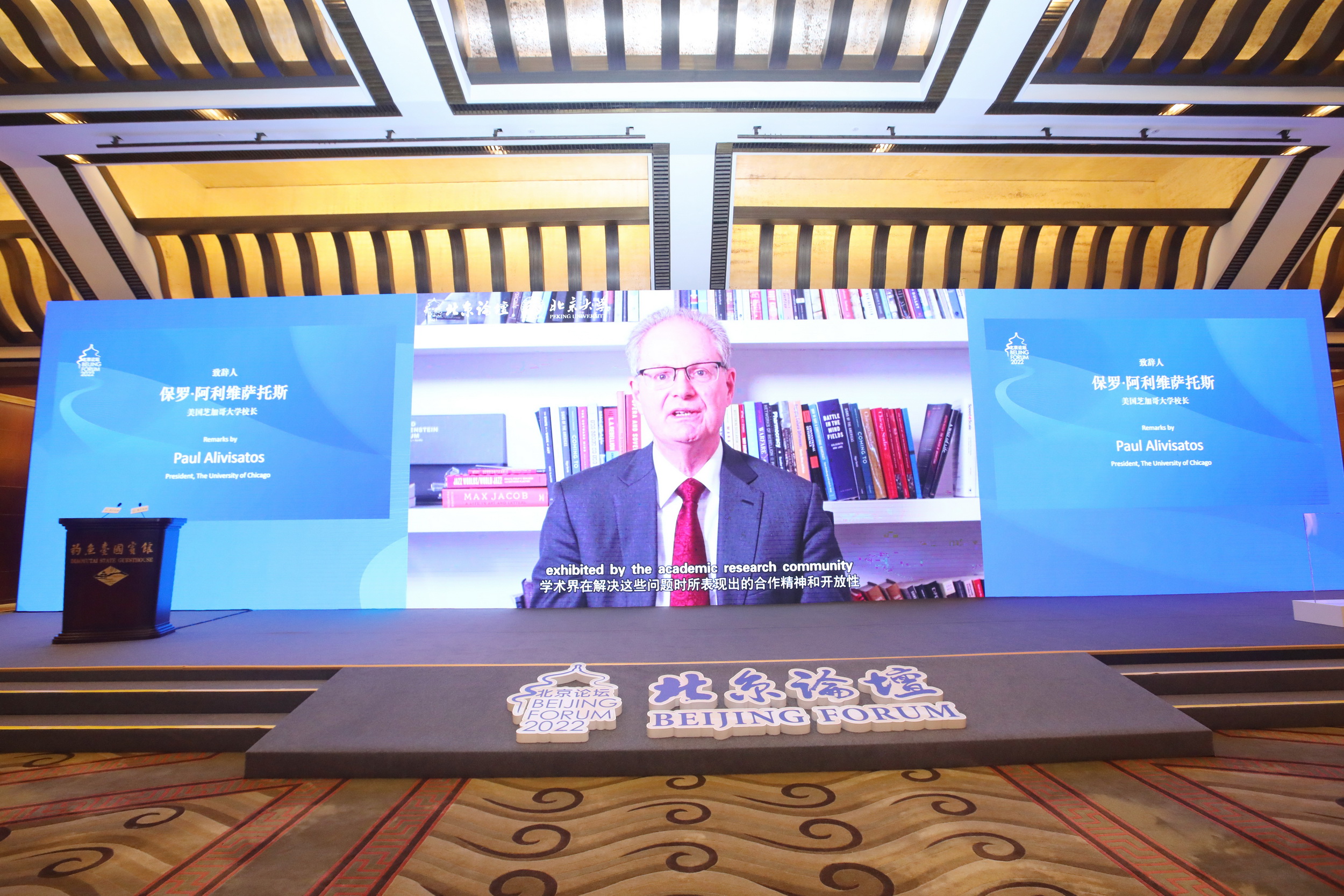 美国芝加哥大学校长保罗·阿利维萨托斯在致辞中,回顾了北京大学与芝加哥大学数十年来的跨学科合作成果及深厚友谊,他期待北京大学芝加哥中心能够开辟出一条令人激动的合作交流新路径,共同推动学术交流和互信互利。他希望学术界所展示的开放包容的合作精神,为更广泛的全球合作提供一种模式,共同寻求应对全球性挑战的解决方案。