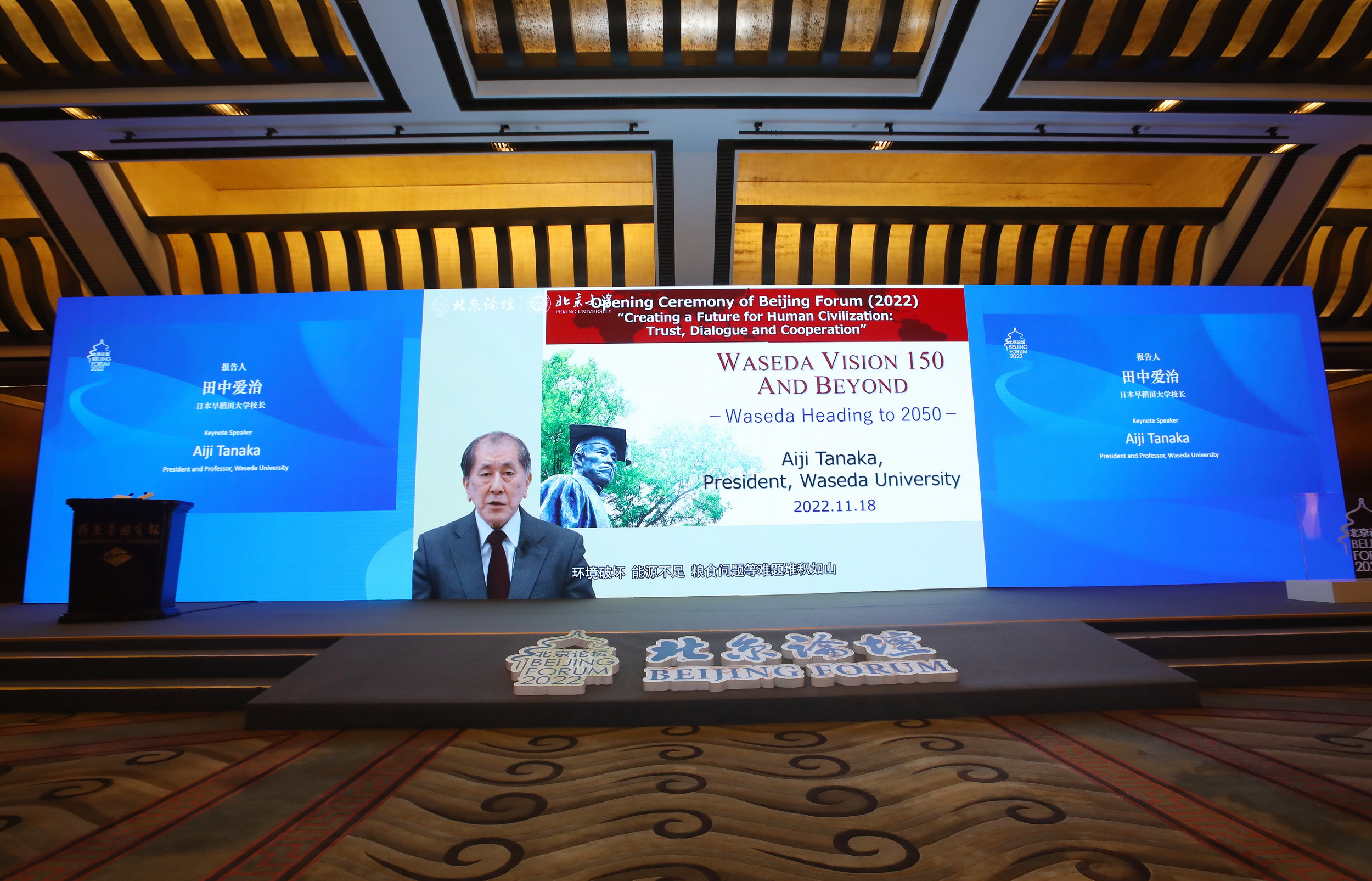 田中爱治在主旨报告中结合早稻田大学在国际化、碳中和、智能城市等方面的实践,提出高等教育界要肩负起促进对话合作、共创人类文明未来的历史使命。与此同时,田中爱治呼吁,在社会高度繁荣、文明高度发达的今天,人们更要对自然充满敬畏,怀着单纯朴素的心态与自然相处。他期待北京论坛能够成为宝贵学术见解的发祥地,学者们把在论坛中获得的知识带回到教学场所,传承给年轻一代,真正实现“文明的和谐与共同繁荣”。