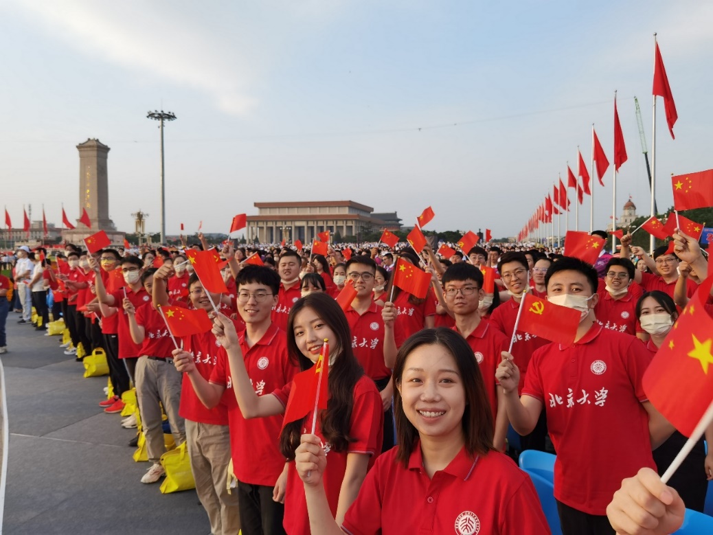 7月1日上午,庆祝中国共产党成立100周年大会在北京天安门广场隆重举行,各界代表7万余人以盛大仪式欢庆中国共产党百年华诞。北大600余名师生参与盛会。